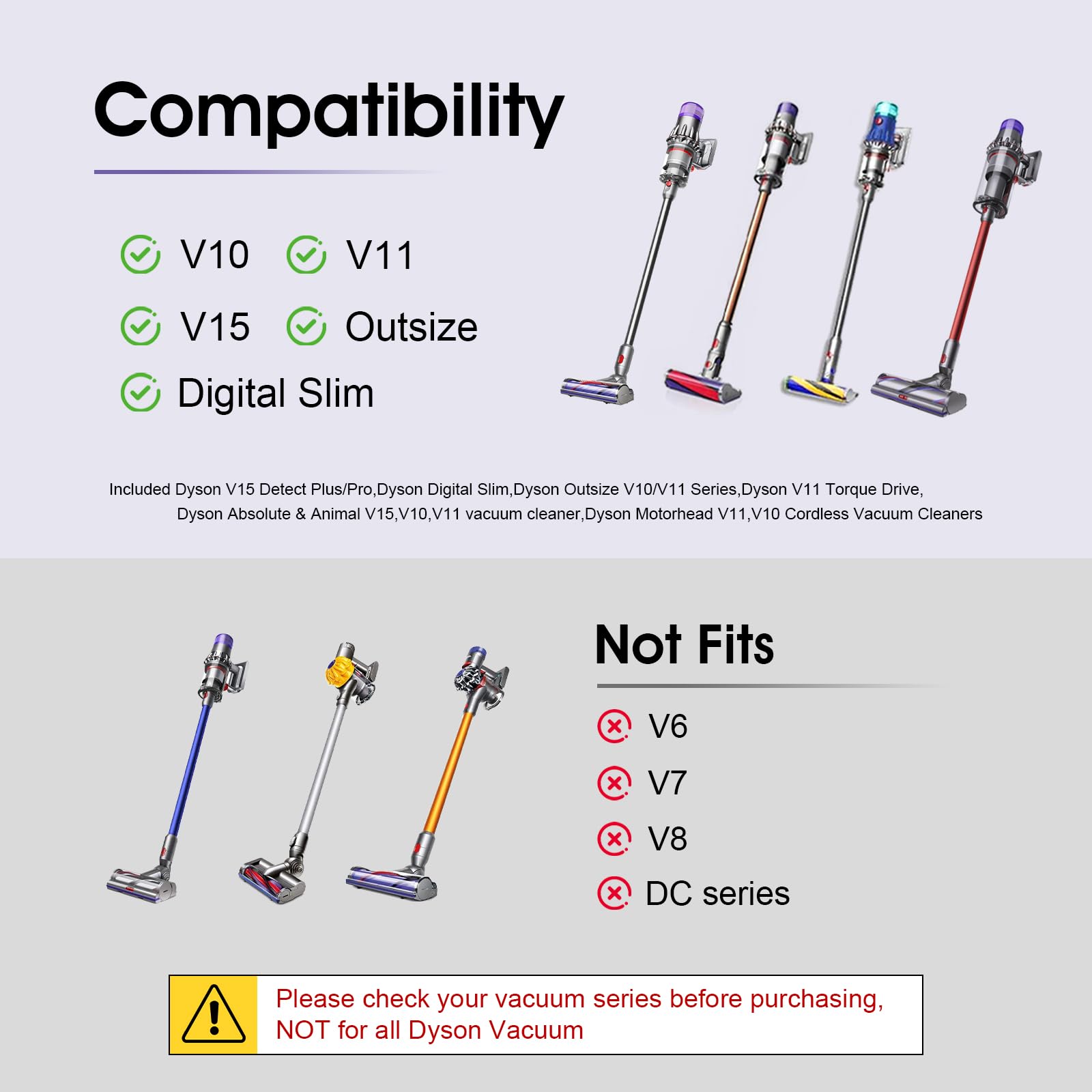 - Fits for Most Dyson Stick Cordless Vacuums – Practical Dyson attachment compatible with most models; NOT fits for any V6/V7/V8,DC series( Please search B08FMHKFFM for compatible trigger lock).FITS for Dyson V15 /V11/V10 /Digital Slim any seres ,included Dyon V15 Detect Plus/Pro ,Dyson Digital Slim,Dyson Outsize V10/V11 Series ,Dyson V11 Torque Drive ,Dyson Absolute &Animal V15,V10,V11 vacuum cleaner, Dyson Motorhead V11,V10 Cordless Vacuum Cleaners
