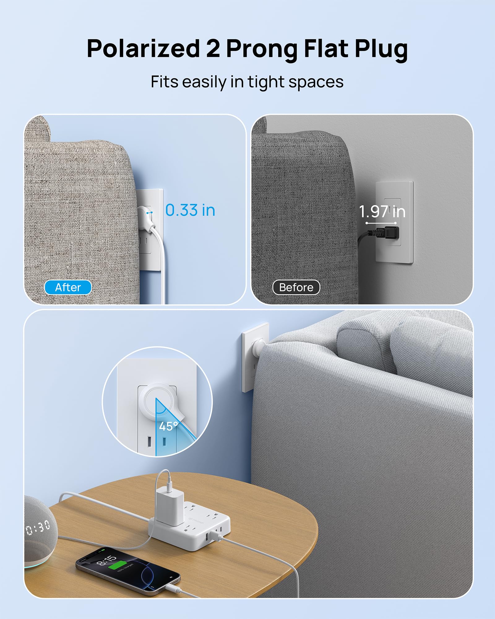 - 2 Prong Flat Plug Power Strip: The two prong to three prong power strip has a thin polarized flat plug(only 0.33 inches thick) that can help you keep your furniture close to the wall and hide the plug discreetly behind furniture. The design with a 45° right angle flat plug won't affect the bottom outlet after inserting it into the top socket of your wall outlet