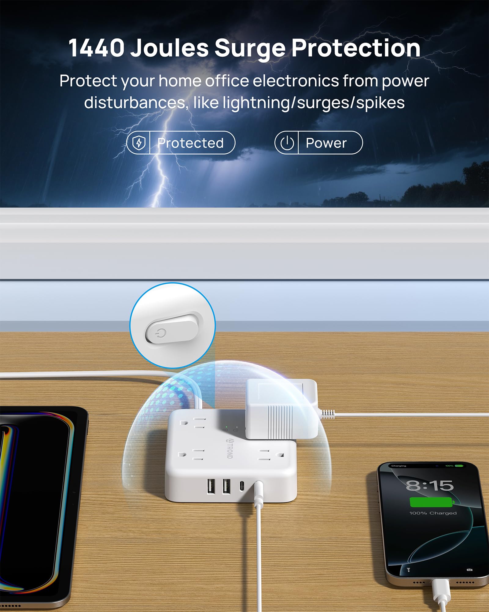 - Two Prong Surge Protector: The flat plug power strip provides 1440J protection for your home office electronics(computers, TV setups, or other valuable electronics) against power disturbances. The green LED light indicates protection and a circuit breaker for overload protection. Made of top-grade UL94 V-0 flame-retardant PC & ABS materials to improve safety and durability