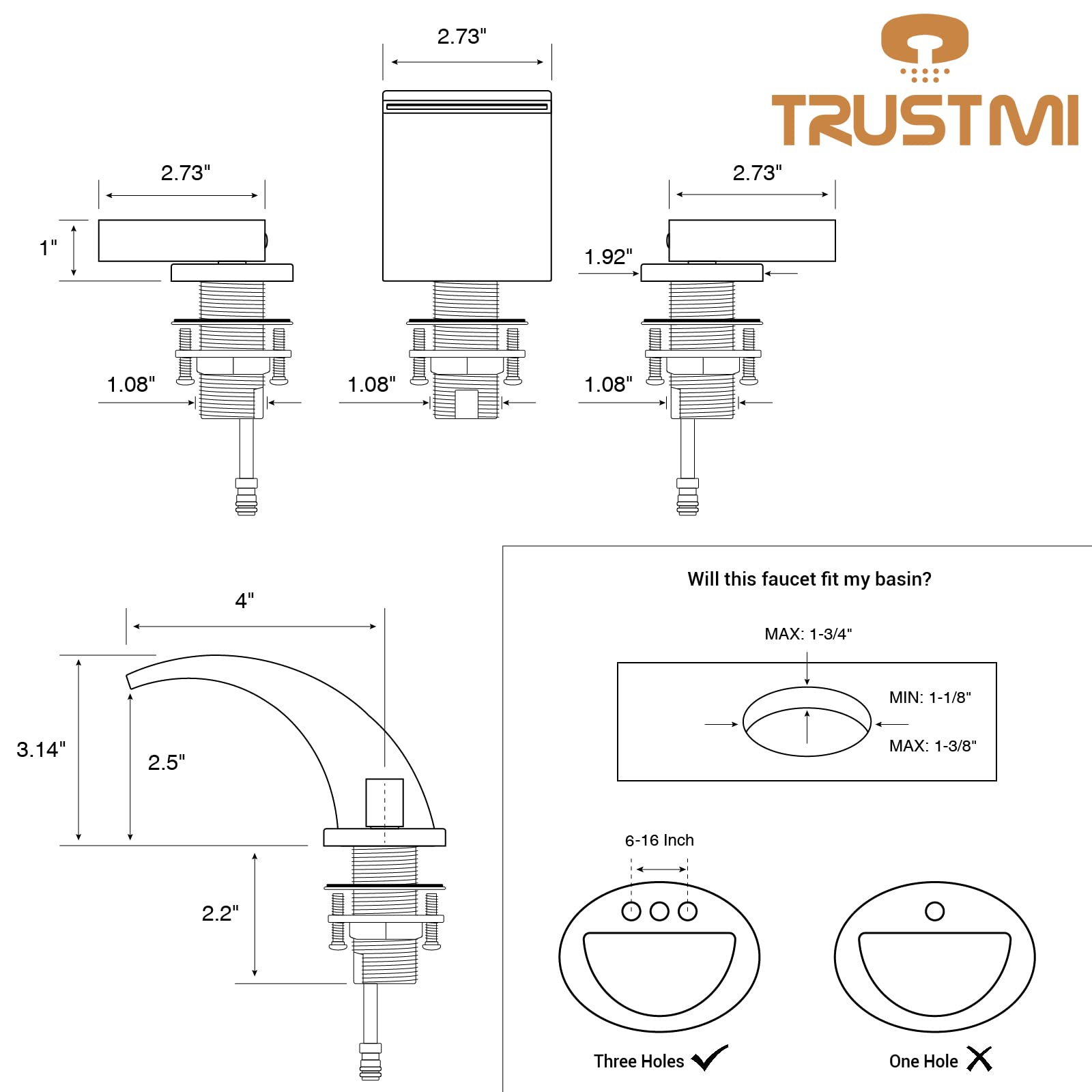 - Overflow sink drain and 23.6 inches long cupc water supply lines included. U.S. standard structure for hassle-free installation. 6-16 inches widespread installation for more customized design. Minimum mounting hole diameter 1-1/8 inch (28.5mm).