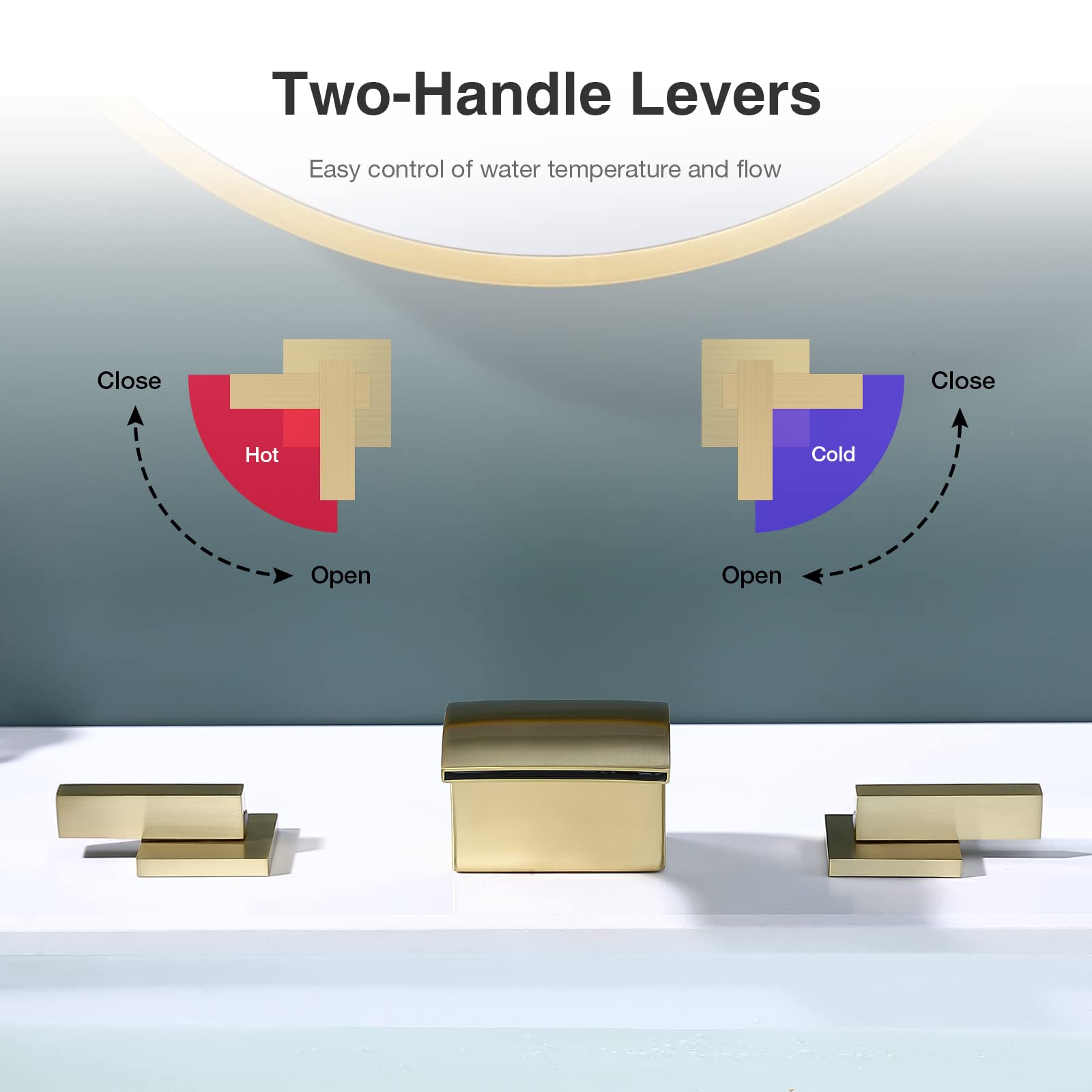 - Brushed gold 2 handle 8 inch widespread bathroom sink faucet, modern square shaped, low profile design can work with bathroom sinks without too much space above it