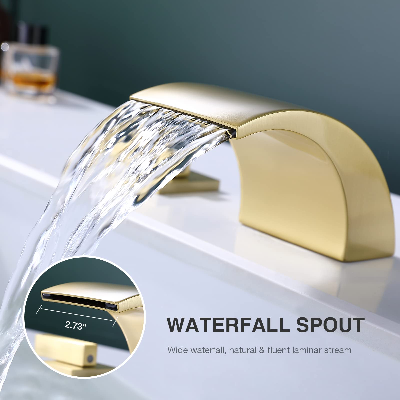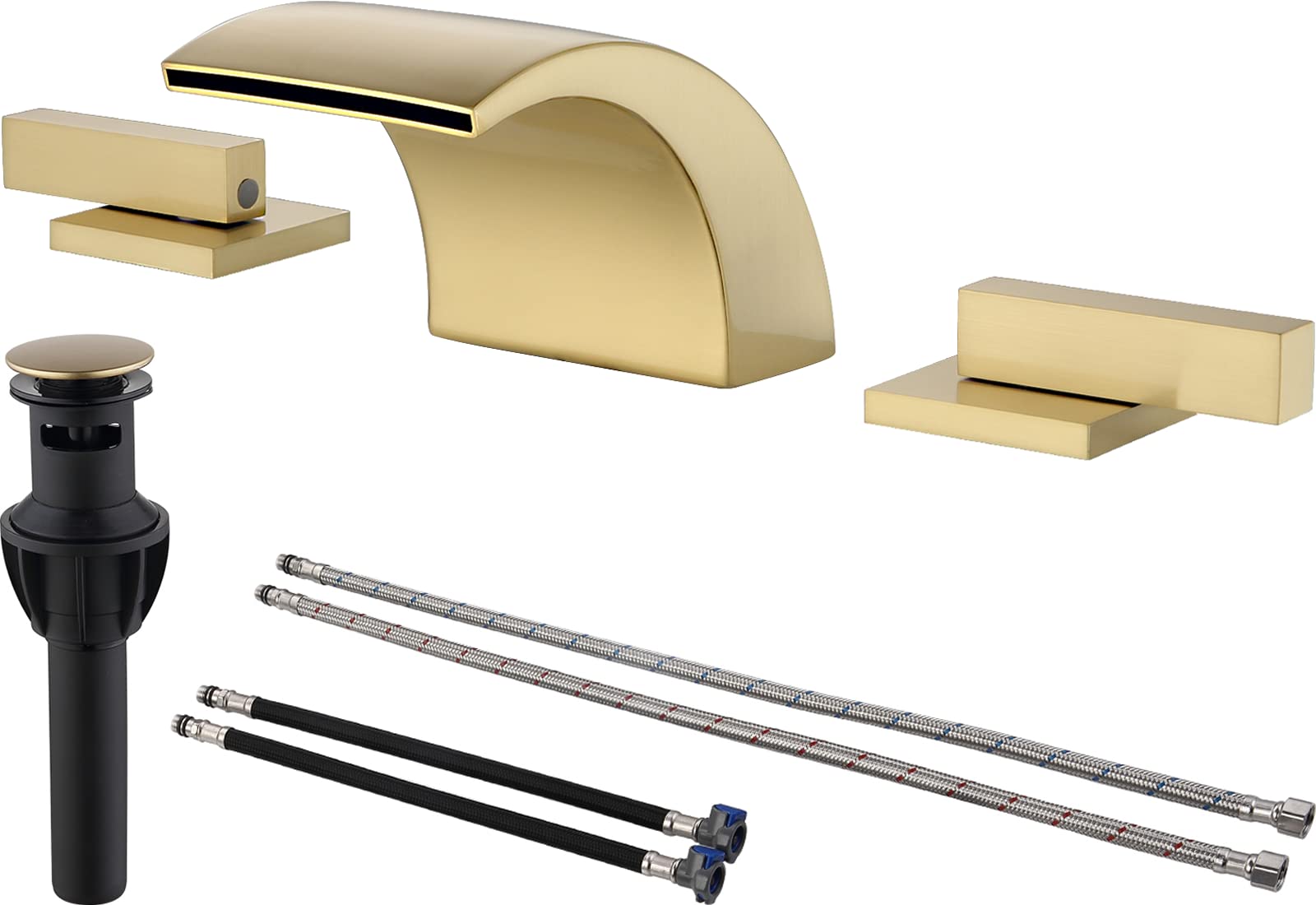 TRUSTMI 8 Inch Widespread Bathroom Faucet Brushed Gold - 2 Handle 3 Hole Lavatory Vanity Sink Faucet with Overflow Pop-Up Drain, Spot Resist, 3.14" Height, 2.7" Wide Waterfall Spout