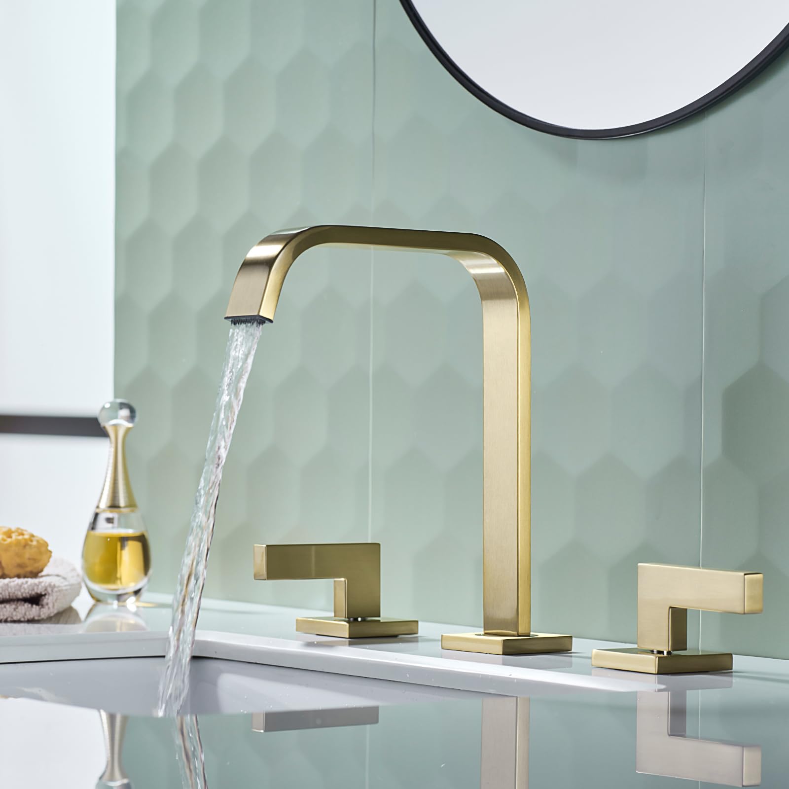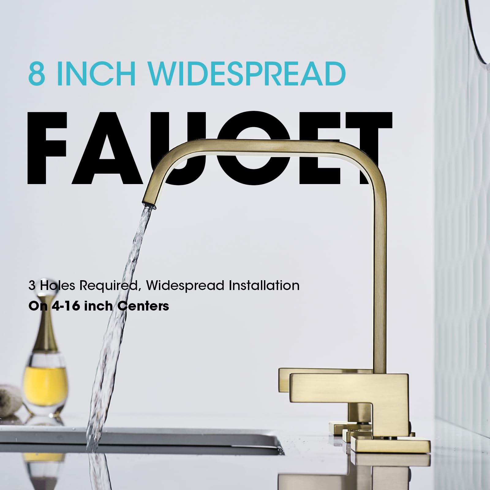 TRUSTMI Brushed Gold Bathroom Faucet 3 Hole 2 Handle 8 Inch Widespread Bathroom Sink Faucet, Brass and Stainless Steel High-Arc Square Swivel Spout