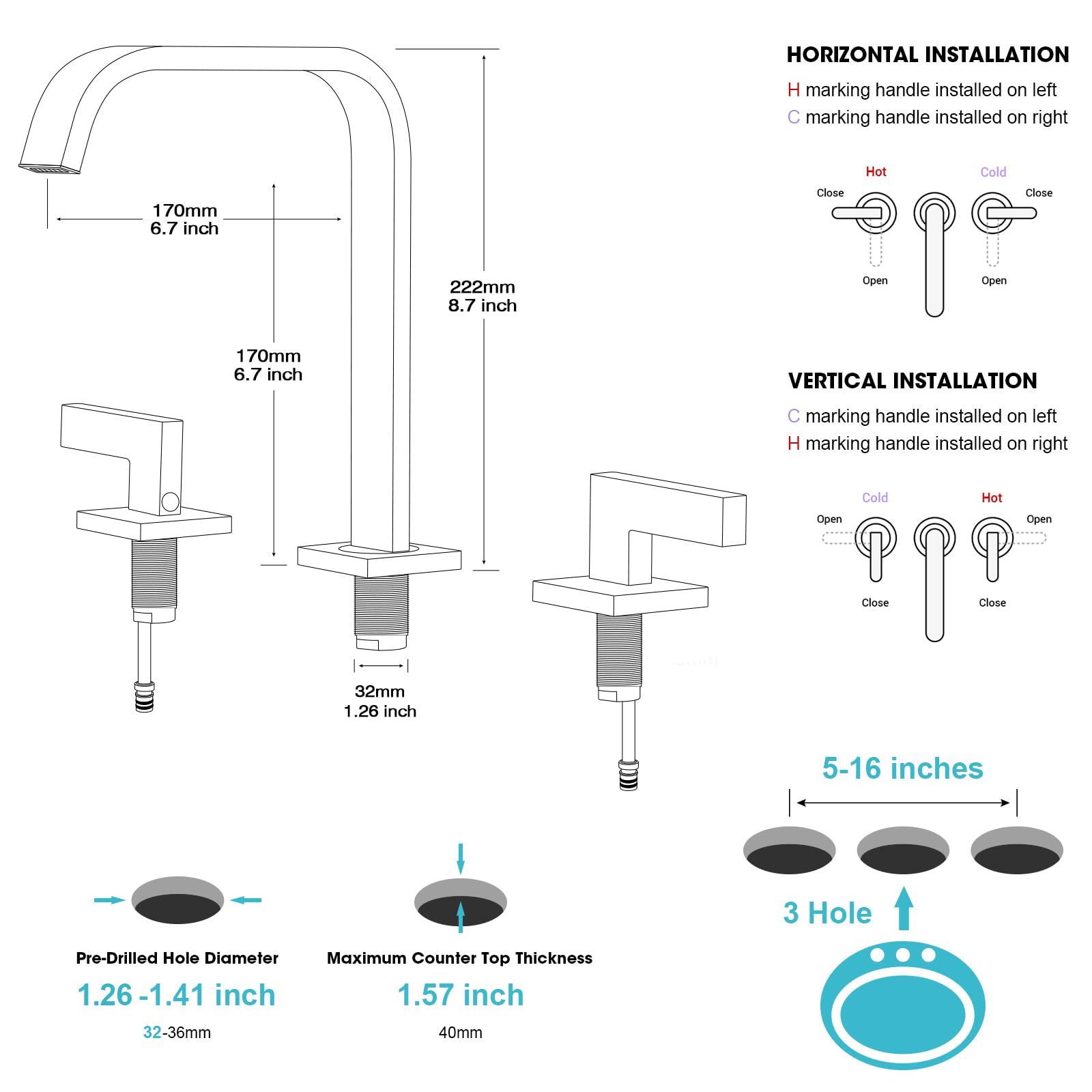 - ใ๐ ๐๐จ๐ฅ๐ ๐๐ข๐๐๐ฌ๐ฉ๐ซ๐๐๐ใ: 2 handle 8 inch bathroom sink faucet, 3 hole 6-16 in. widespread installation on vanity counter top, mounting hole diameter should between 32mm to 36mm (1.26 - 1.41 inch), maximum counter top thickness is 40mm (1.57 inch)