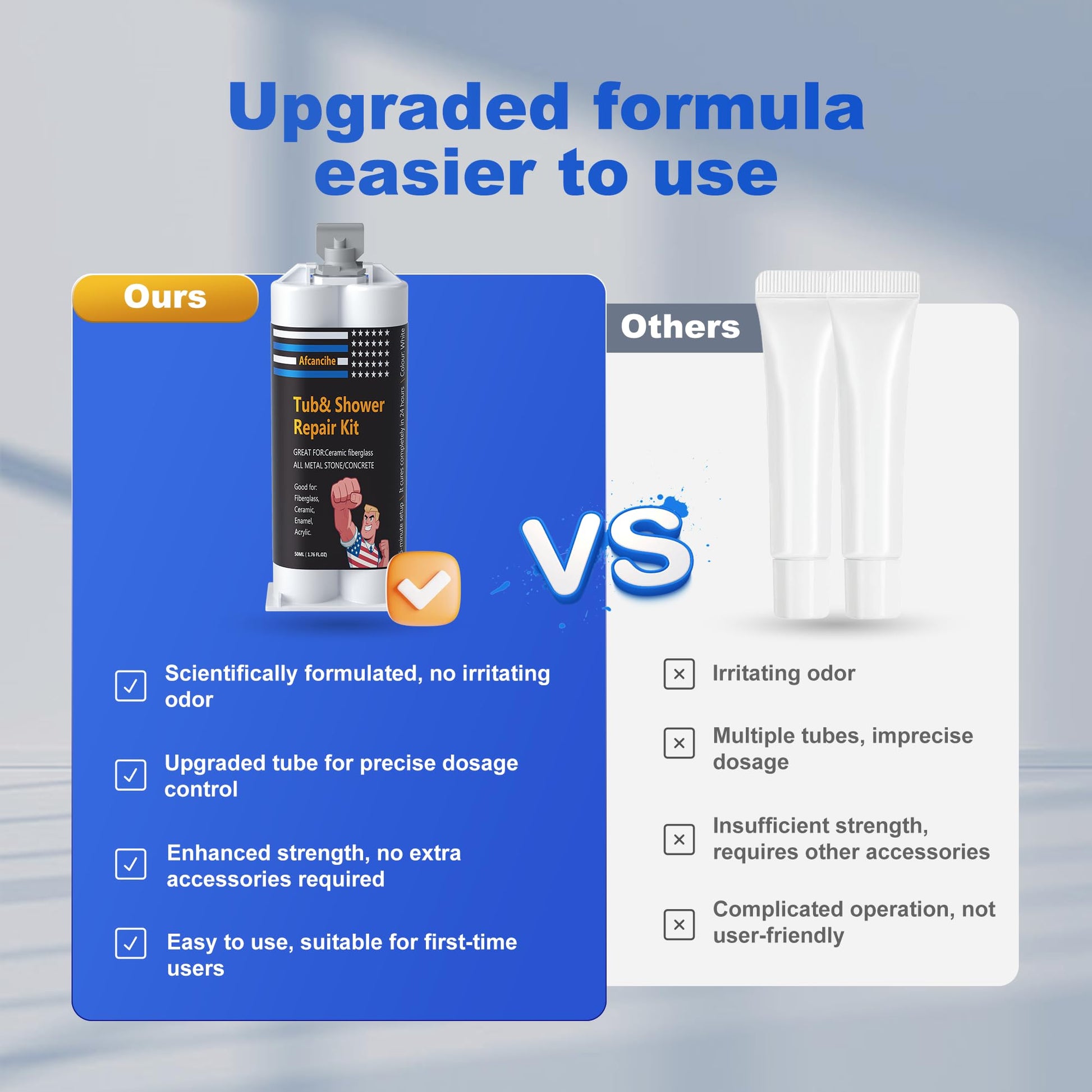 - Compared with most similar products on the market, the Afcancihe bathtub repair kit uses a new formula that is non-irritating, does not shrink, yellow, or mold after use, and is widely used in projects that involve long-term contact with water. The upgraded two-in-one push tube simplifies the usage process and ensures precise application, making it very user-friendly for first-time users.
