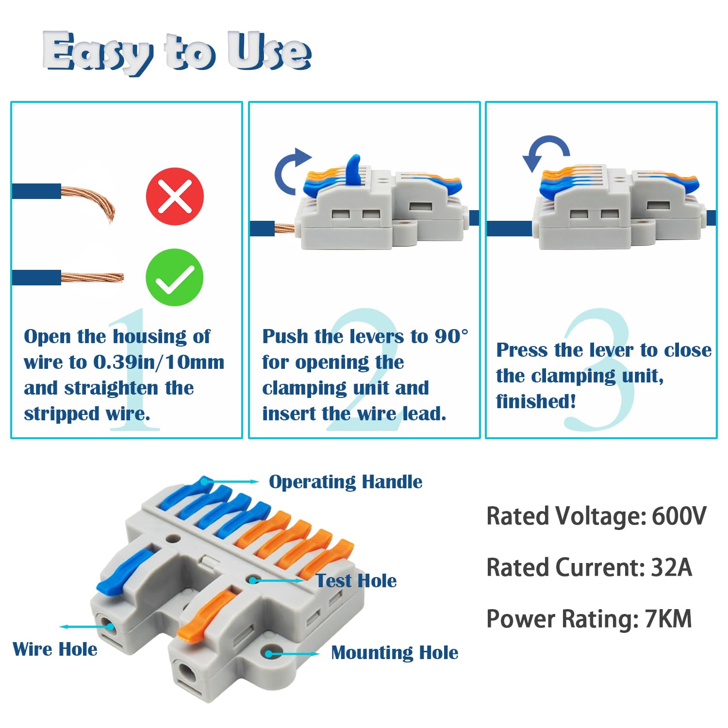 - PRODUCT SPECIFICATION: This screw terminal block connector rated voltage is 600V, rated current is 32A, applicable for 0.08-4.0mm²/28-12AWG hard wire or 0.08-2.5mm²/28-14AWG soft wire, it can work continuously between -40℃and 105℃