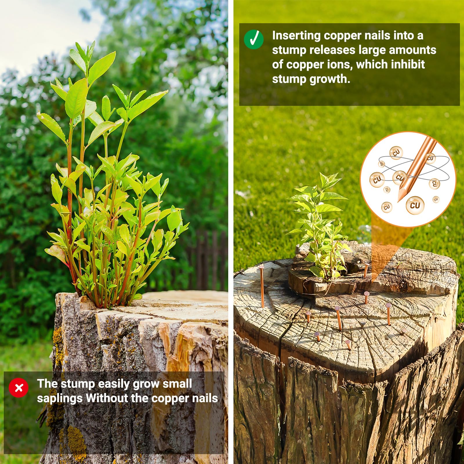 - Easy to Use: Because copper is a soft material, a drill is used to make holes in the roots, then the copper nails are hammered into the holes, and finally the nails are evenly driven around the base of the stump.