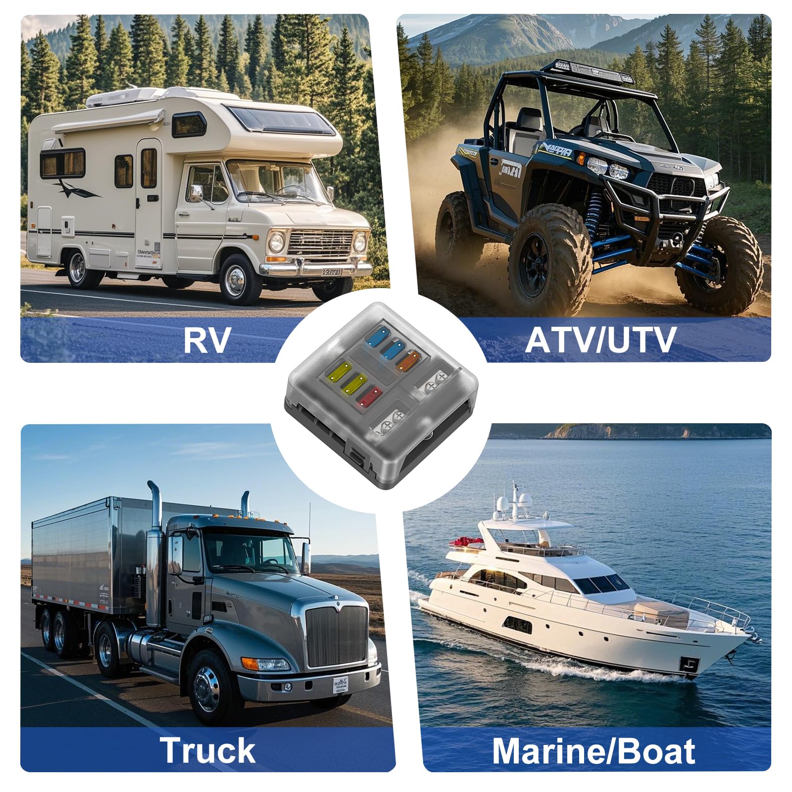 - 【Wide Compatibility】--The fuse panel includes a variety of fuses. It is suitable for multiple applications including cars, motorbikes, trucks, boats, tractors, vehicle modifications and RV circuit optimisation