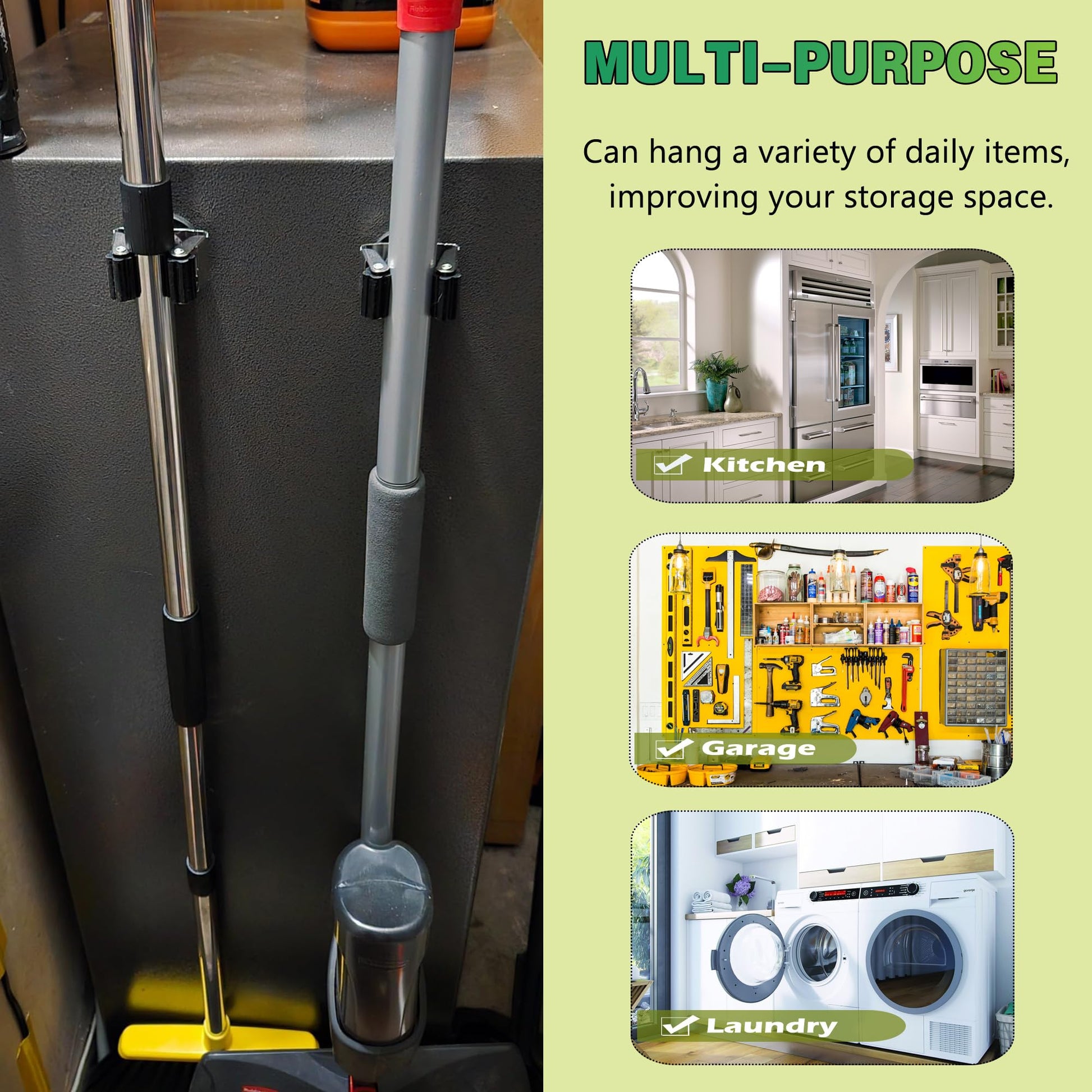 - [Multi-purpose Magnetic Mop Clip]: This mop holder can be widely used for storage to keep your laundry, garden, garage clean and tidy. From umbrellas, mops, shovels, brooms to gardening or hardware tools, we can use this holder to hold them all