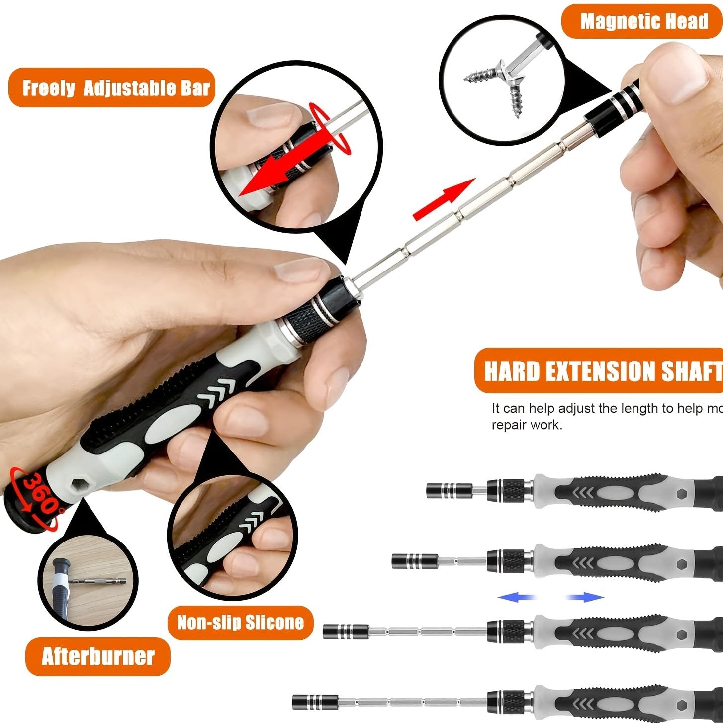 - 【Anti Slip Design Handle】The ergonomic handle of the precision screwdriver kit is comfortable to hold even for the long-time use. Equipped with a hard extension shaft and a flexible extension shaft which is easy to be extended to a tight space where the handle cannot enter.