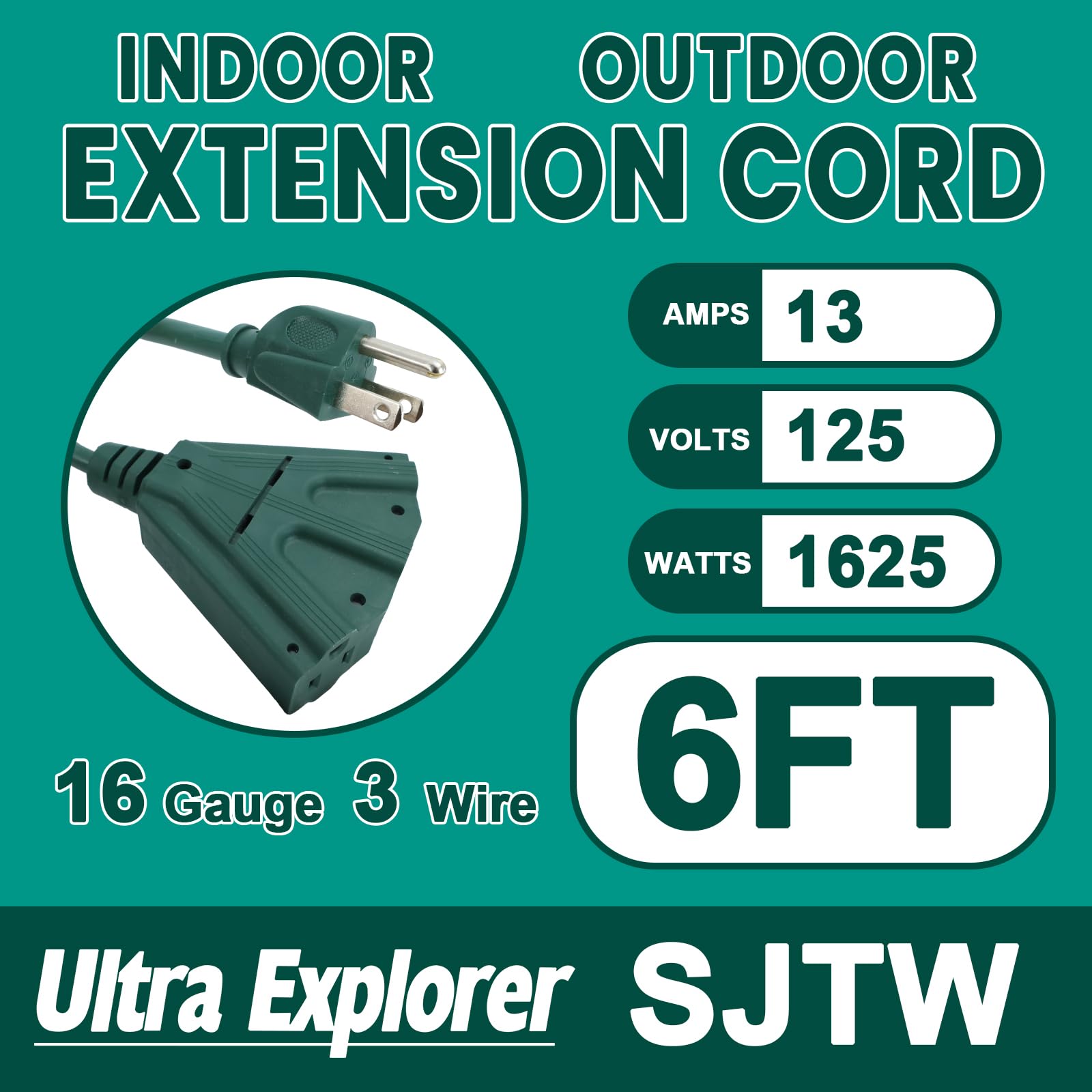 Ultra Explorer 6 Ft Outdoor Extension Cord with 3 Electrical Power Outlets - 16/3 SJTW Long-Lasting Green Cable with 3 Prong Grounded Plug