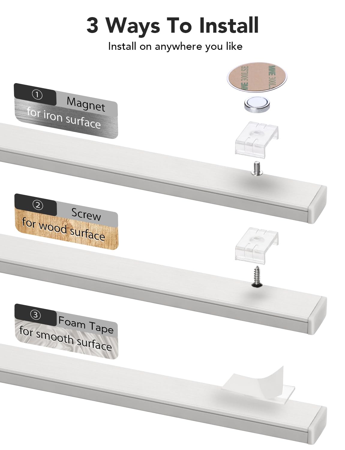 - 【Easy Installation】Having magnets and double sided tape Included, this under cabinet lights snaps onto the mounting strip as well as any other magnetic metal surface like a fridge. The adhesive on the has strong bonding characteristics also with water and heat resistant ability.