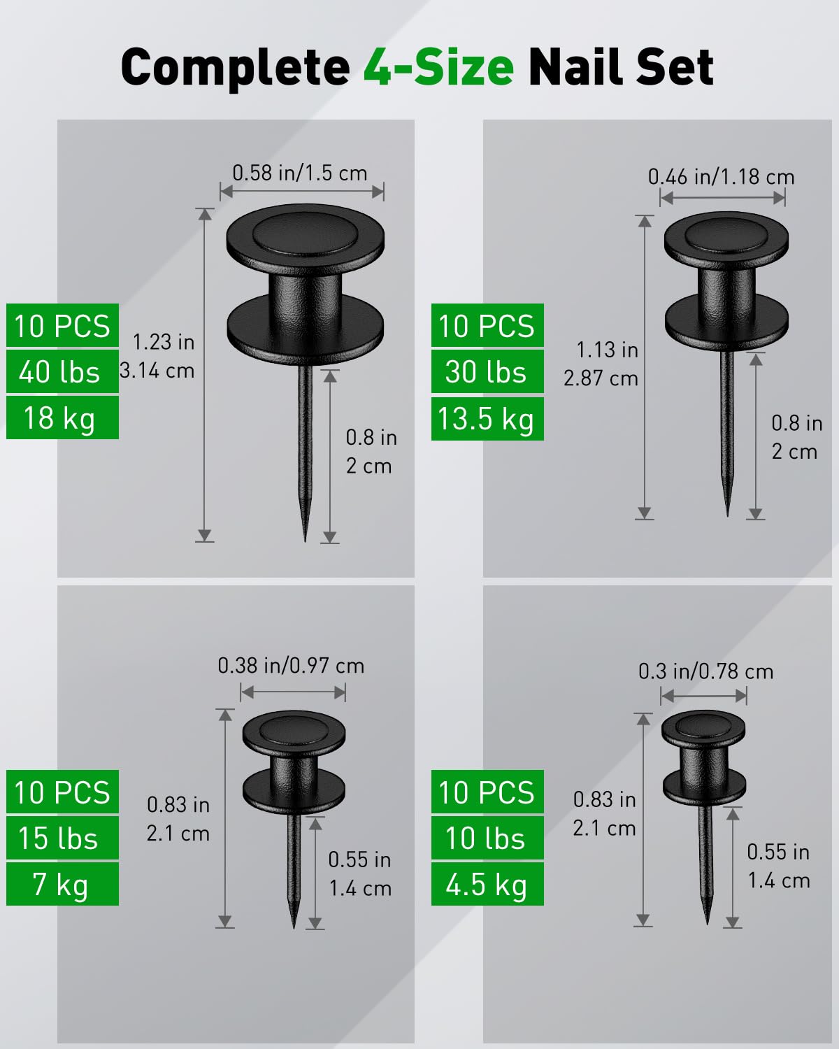 - Complete 4-Size Nail Set: Include 10 mini, 10 small, 10 medium, and 10 large thumb tacks – supporting up to 10 lbs, 15 lbs, 30 lbs, and 40 lbs respectively. Ideal for easy DIY projects, wall décor, and secure wall mounting