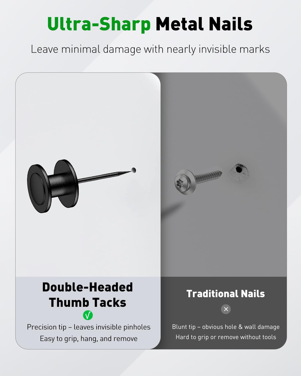 Uniclife 40 Pcs Thumb Tacks, Double Headed Picture Hangers, 4 Size Push Pins for Wall, Picture Hanging Nails, Long Wall Hooks for Pictures Photo Frame Tapestry and Decor, Black