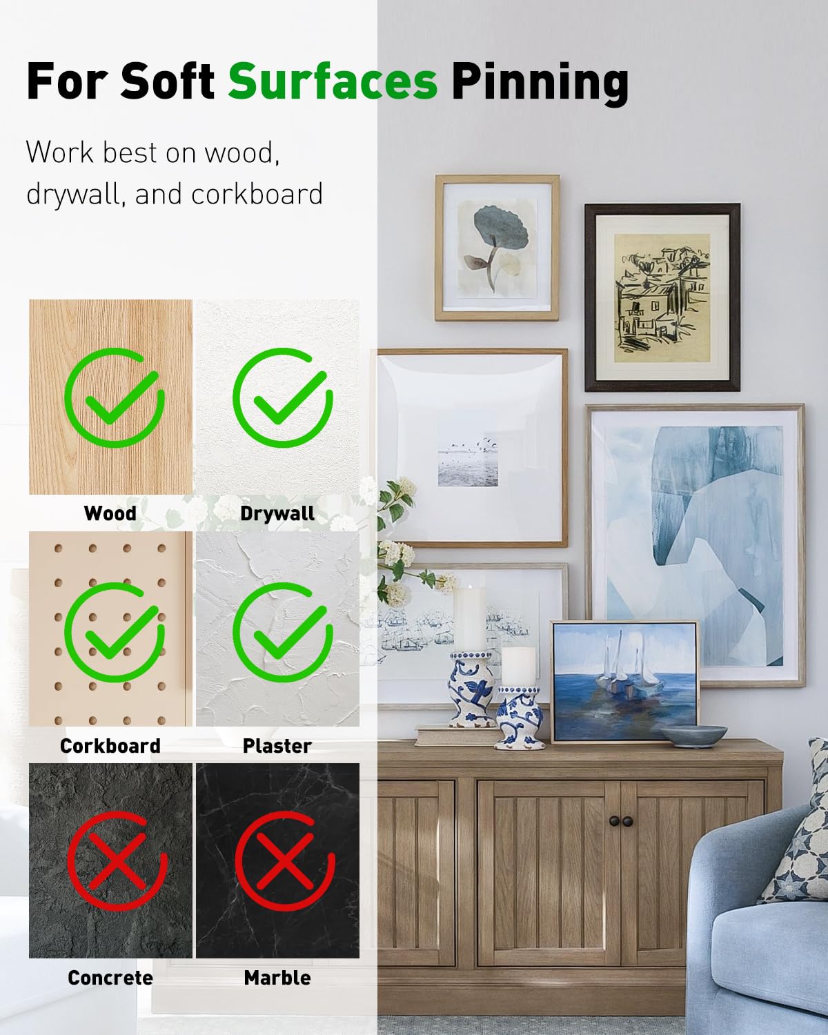 - Easy to Use: No drilling required! Just position the push pin and tap the nail into the wall for stable hanging – works best on wood, drywall, corkboard, and plaster. NOTE: Not suitable for hard or brittle surfaces such as concrete, glass, tile, or lime