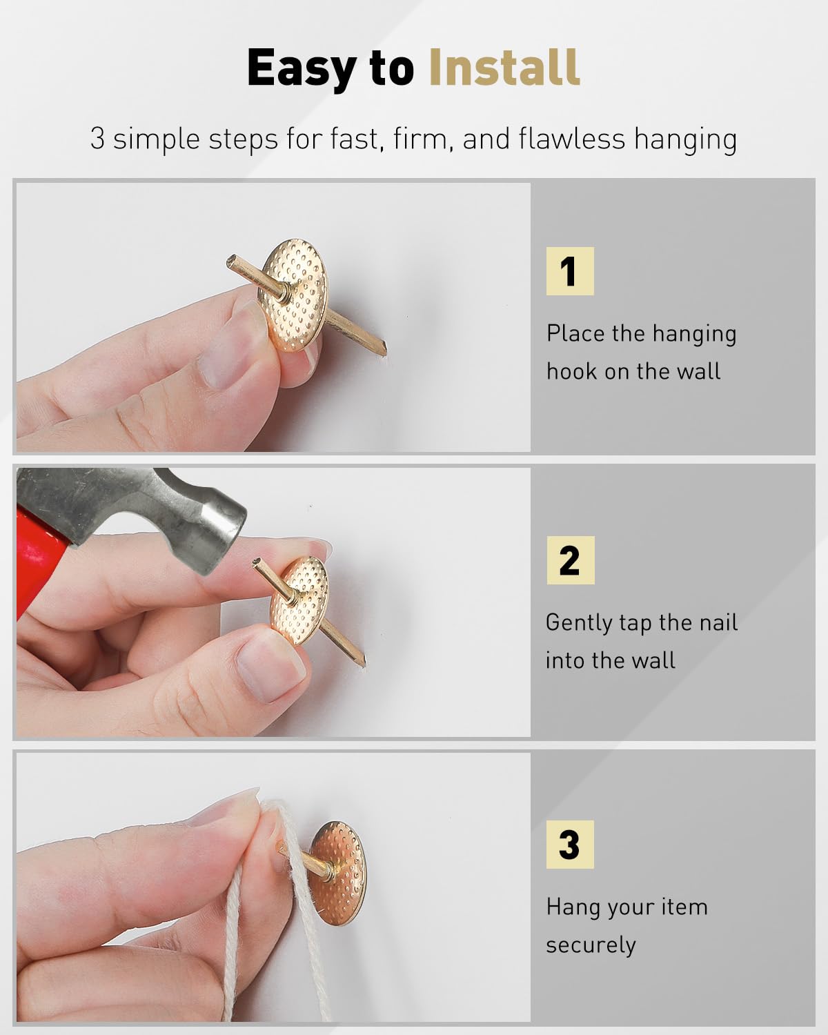 - Easy to Use: No drilling required! Just position the picture hook and tap the nail into the wall for stable hanging—works best on wood, drywall, corkboard, and plaster. NOTE: Not suitable for hard or brittle surfaces such as concrete, glass, tile, or lime
