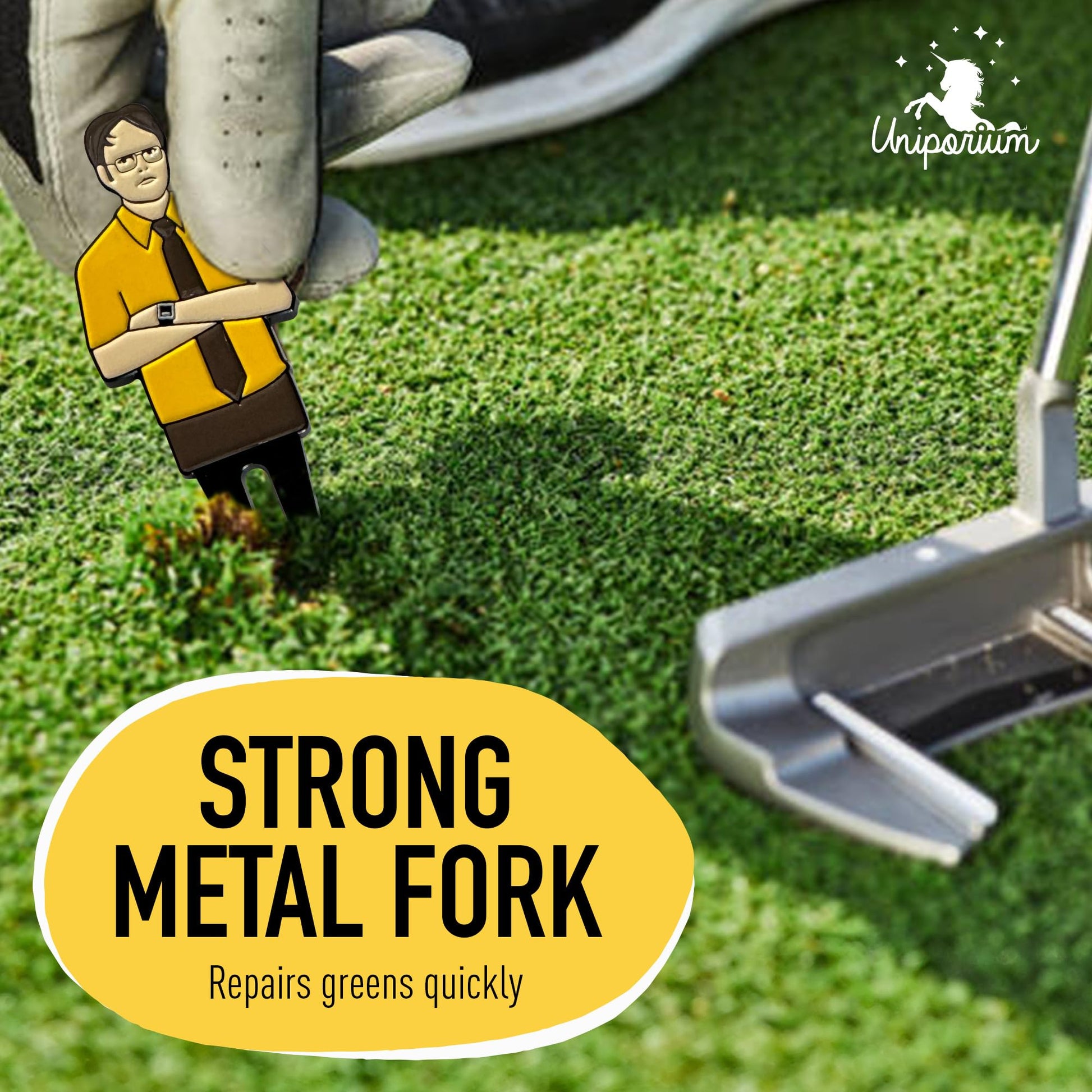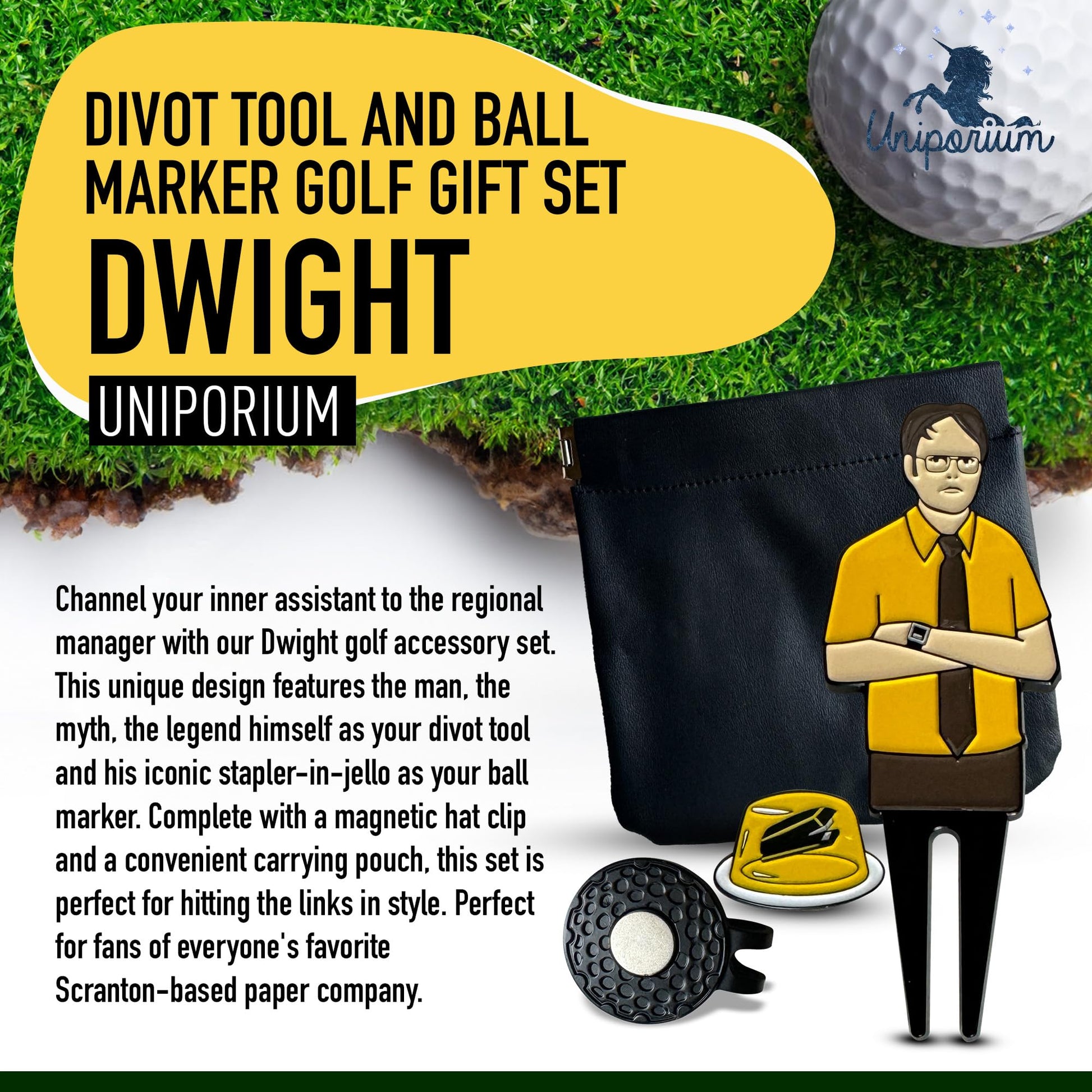 - FUNNY DIVOT TOOL GIFT SET – Stand out on the green with our unique Dwight Divot Tool Gift Set that features a magnetic divot repair tool, ball marker, & hat clip that comes in a black pouch. Ideal for golf enthusiasts who appreciate a touch of humor.