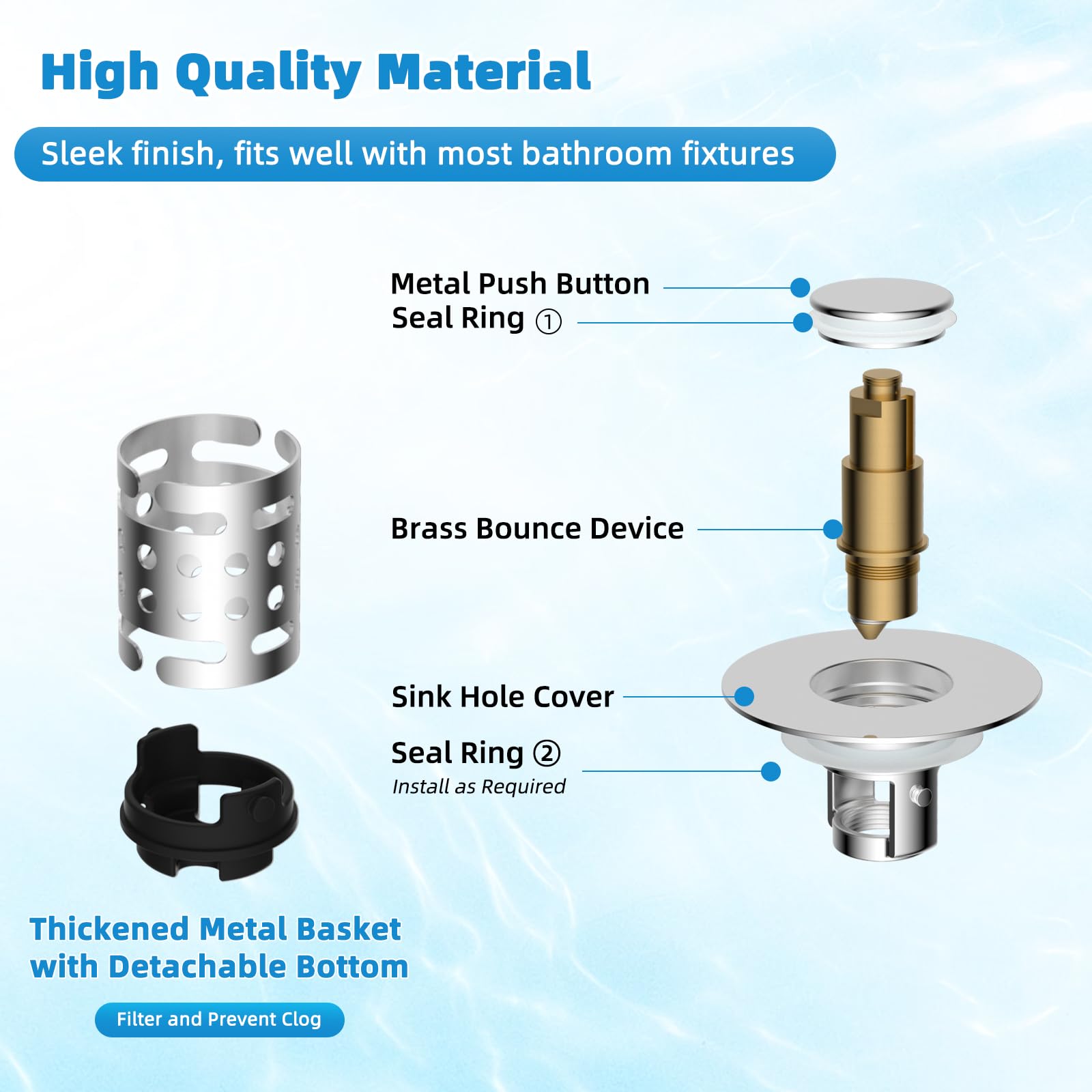 - Practical Stylish Design: Made of high-quality stainless steel and brass with a sleek Chrome finish, it fits well with most bathroom fixtures and decor styles; This sink stopper is tough, crack-resistant, and resists tarnishing, designed for a long time use