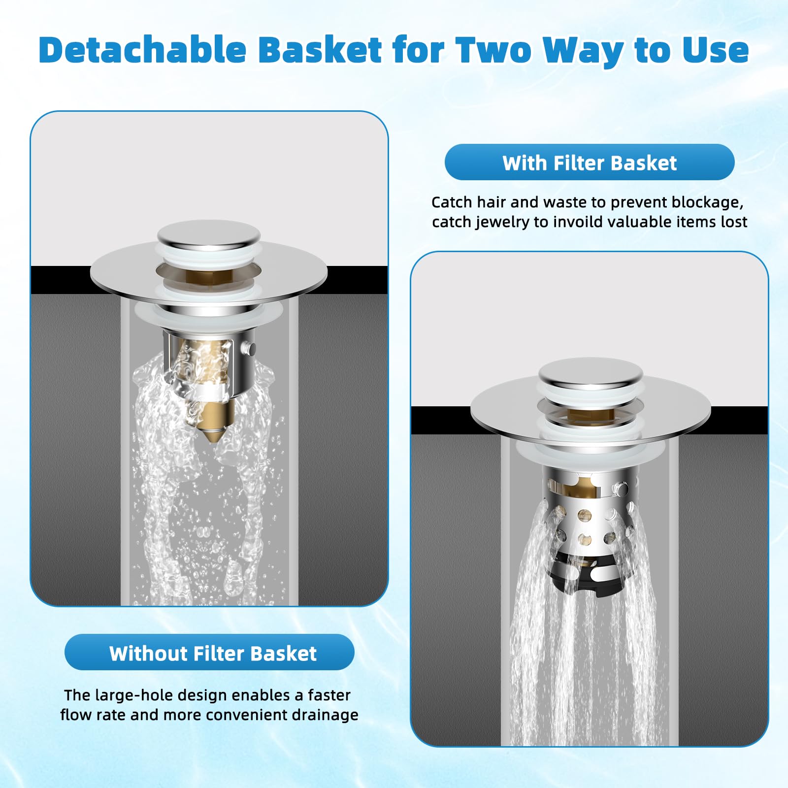 - Upgraded 4-in-1 Design: Unlike the basic bathroom sink drain, it combines 4 powerful functions: Great Hair Catcher/Protection of Valuable Items/Water Storage/Quick drainage. The innovative 2-layer detachable filter basket can catch hair, contact lenses, eyelashes, jewelry, and debris. 2-layer design, making it easy to catch and clean, anti-clog, effectively solving the bathroom sink's plumbing problem, and also combats sink inside odor
