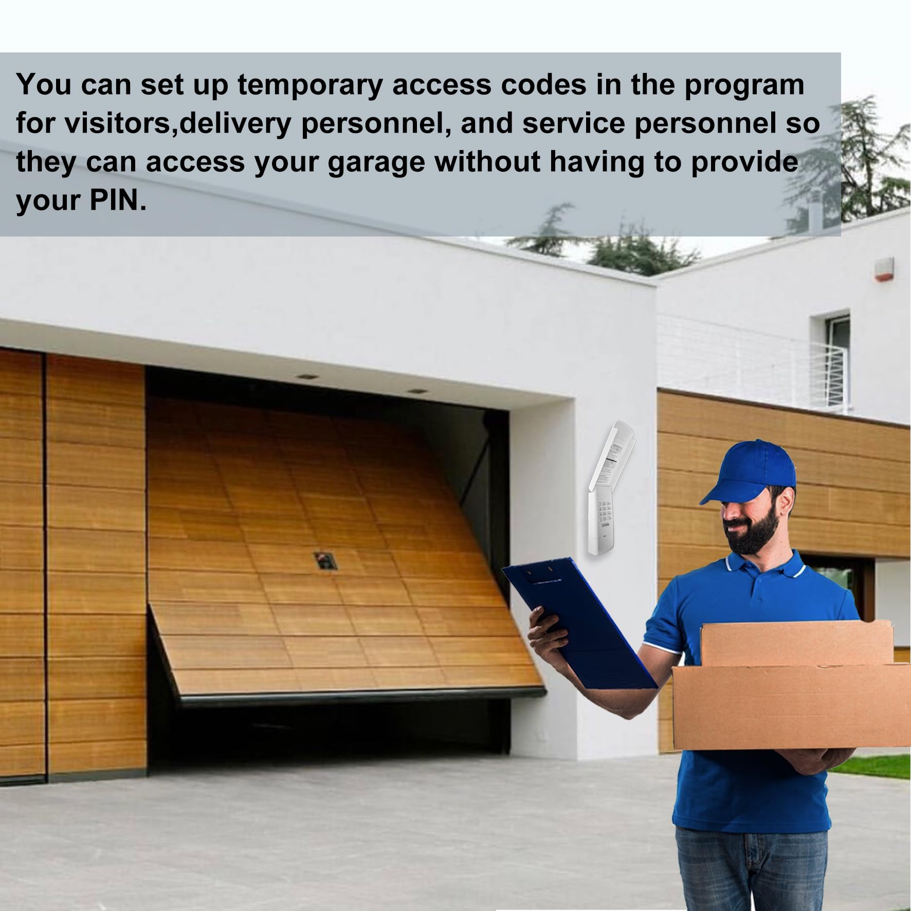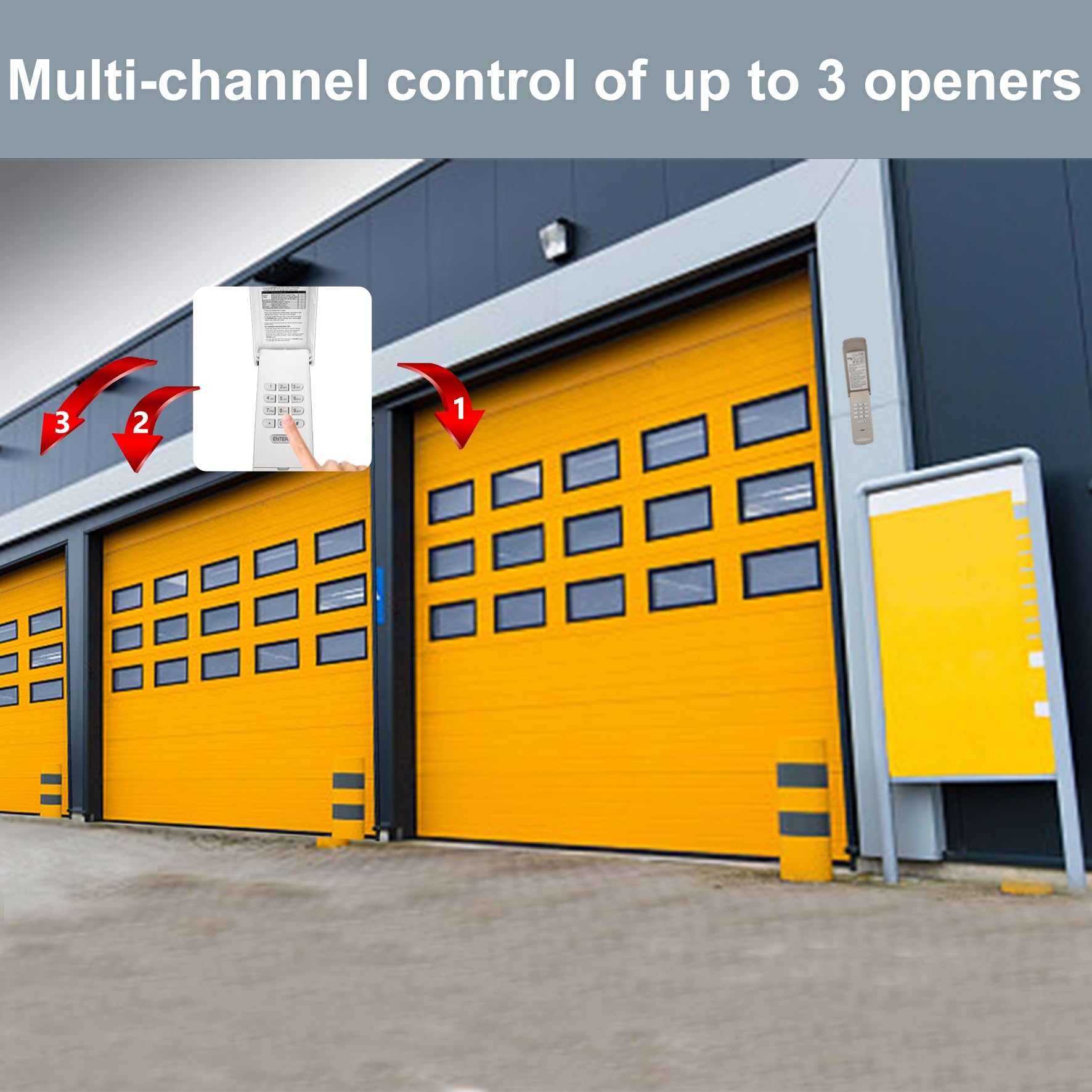- SECURE AND RELIABLE: This garage door keypad features the latest Security rolling code technology that easily synchronizes with existing door opener frequencies to eliminate radio wave interference. Rigorously tested using specialized test equipment. This keypad has 3 channels for 3 door openers, so you can control up to 3 motor units with just one keypad.Temporary Password: Can be provided to maintenance personnel, meter readers, house sitters, etc. while you are away without revealing your family's private entrance code.