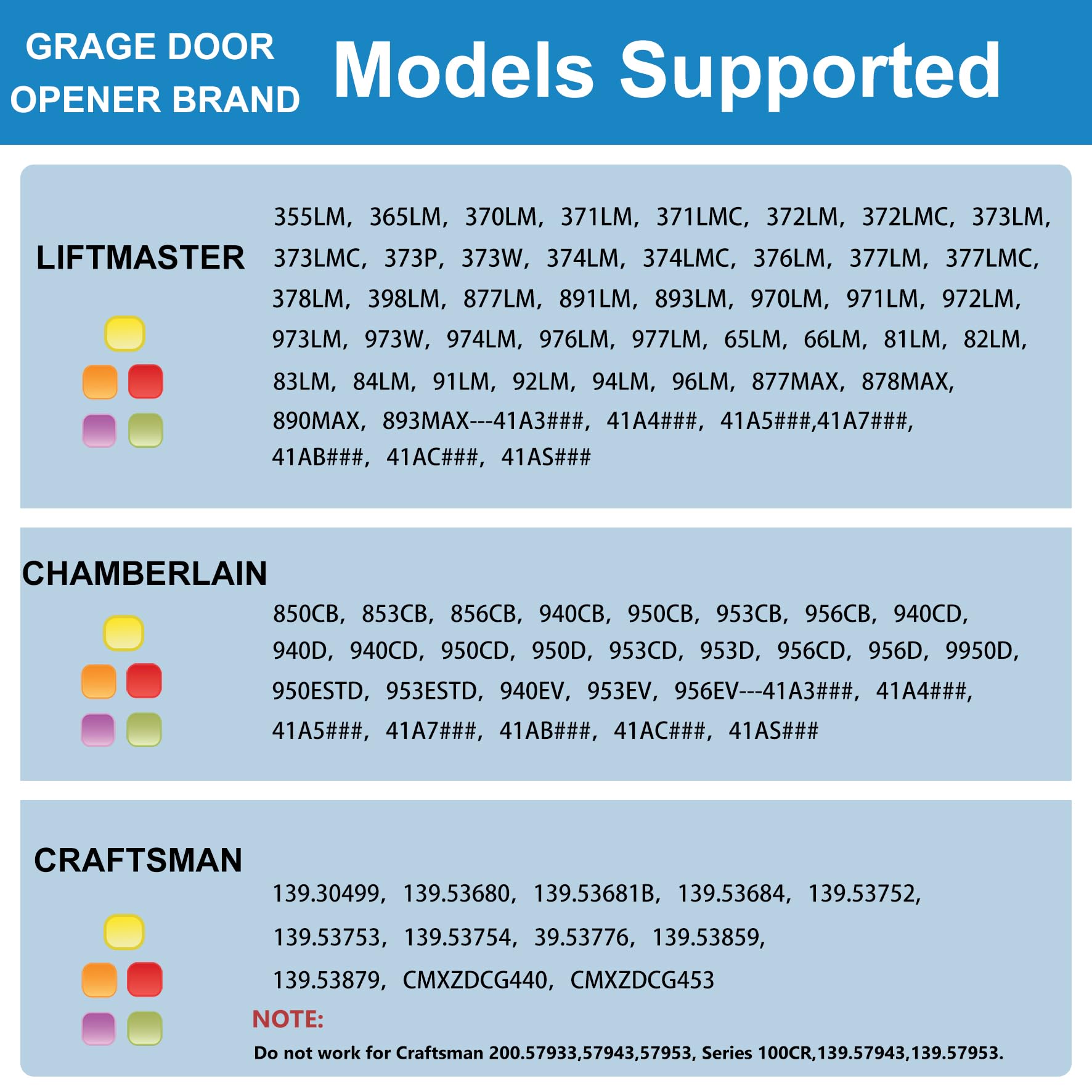 - WIDE COMPATIBILITY: This wireless garage door keypad is compatible with Liftmaster, Chamberlain, Wayne Dalton, and Sears Craftsman garage door openers with purple yellow red orange green learn buttons from 1993 to present. Does not work with Craftsman 200.57933 57943 57953 Series 100 CR1150 139.57943 139.57953