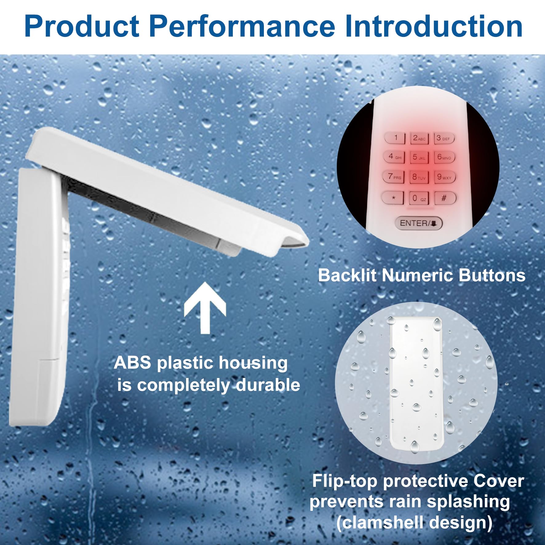 - EASY TO INSTALL AND USE: The keyless entry system offers wireless installation and wireless programming. A rain cover is included. Large backlit buttons on the keypad provide quick and easy access. Offers a one-touch closing feature that makes closing the garage door easier than ever