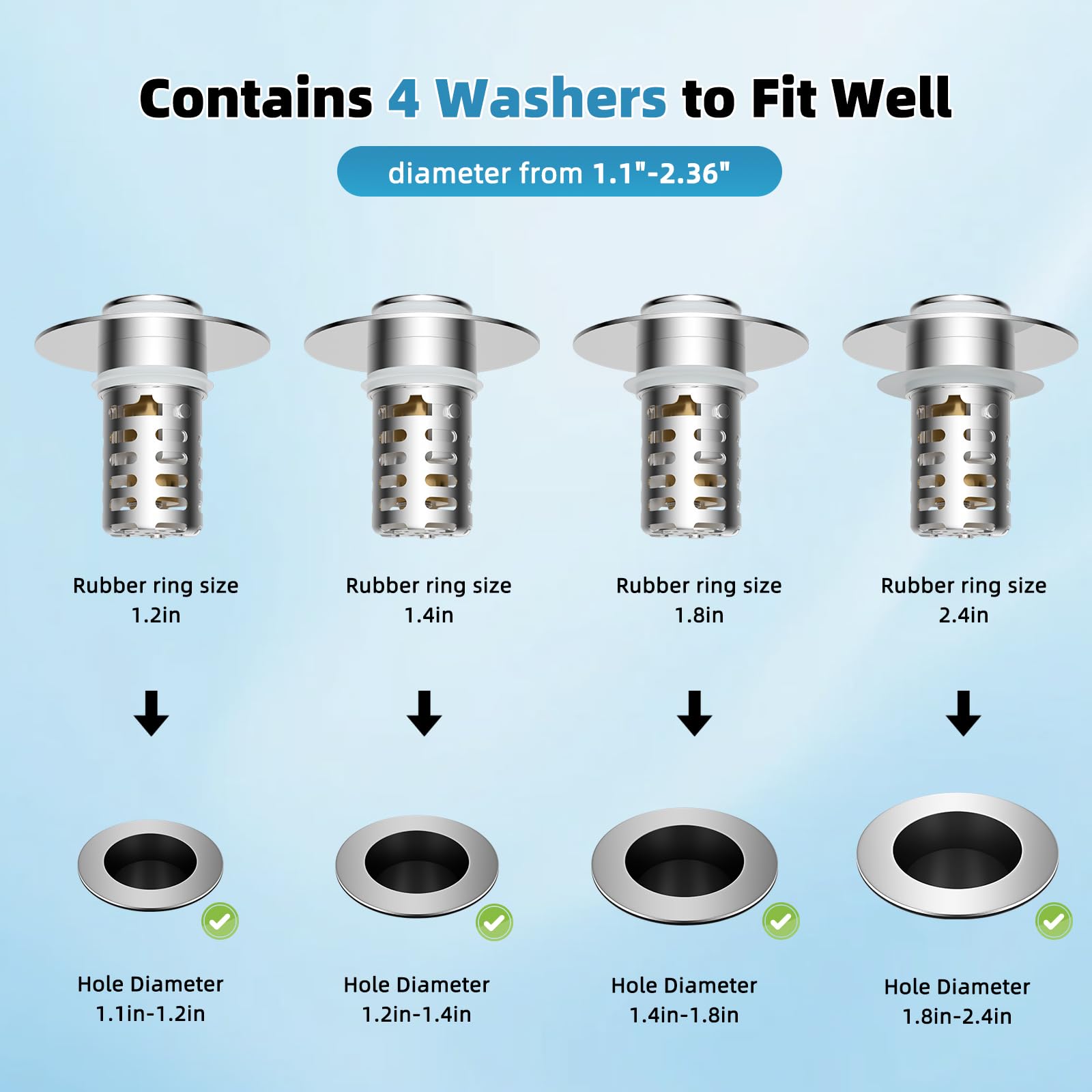 - Almost Universal Fit: Designed for maximum compatibility, the Anylock bathroom sink drainer fits nearly all standard U.S. bathroom sink drain holes ranging from 1.1 to 2.36 inches in diameter. It comes with 4 silicone rings to ensure a secure fit for approximately 99% of standard drains. Note: Suitable for bathroom basin sinks only (NOT FOR BATHTUB); Covered with a sleek Chrome finish, it fits well with most bathroom fixtures and decor styles