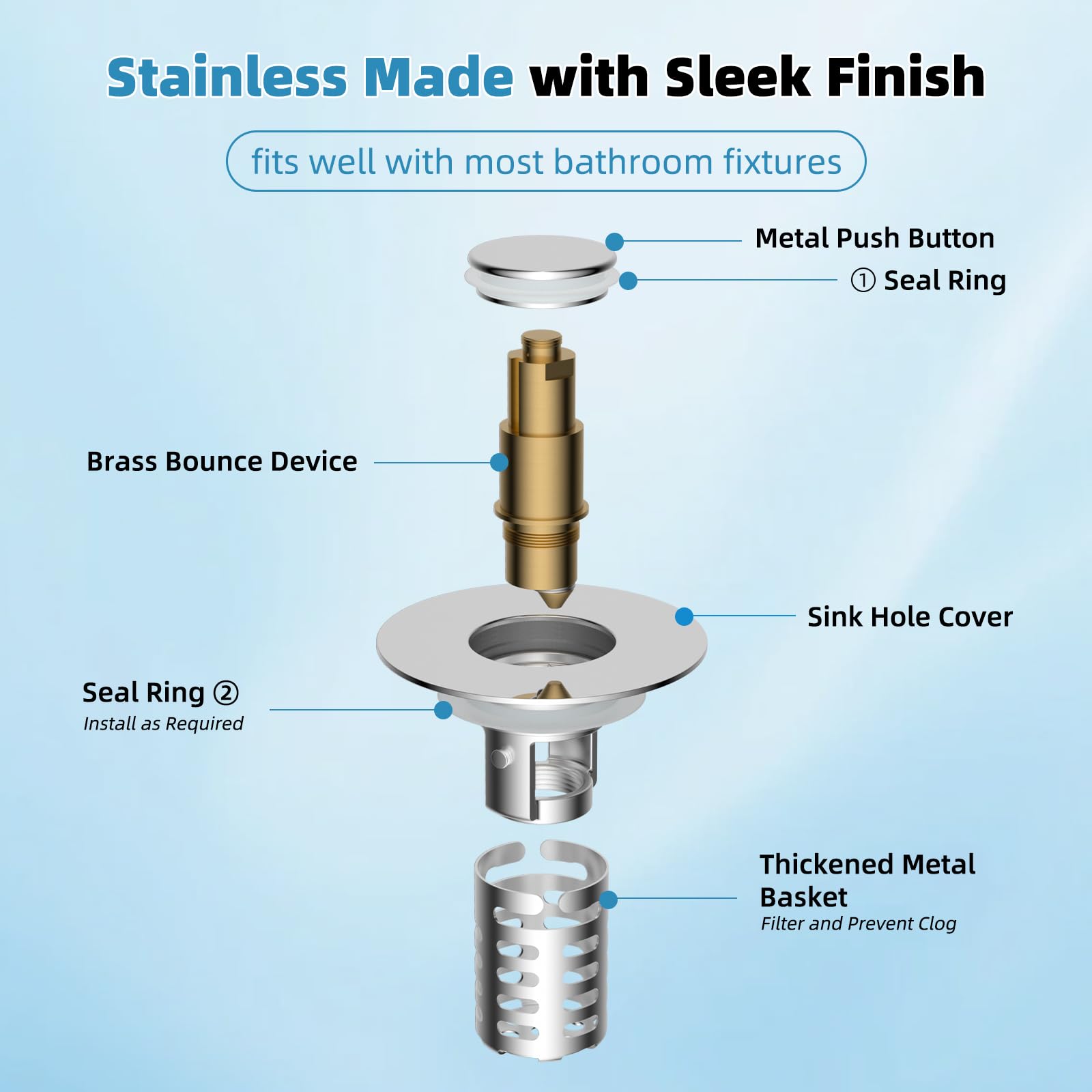 - High-Quality Stainless Steel Construction: The unit is securely anchored by a robust stainless steel base and a pop-up brass bullet core mechanism, enabling effortless water sealing and drainage through a spring-operated handle. Two layers of rubber washers around the drain ensure a tight seal, preventing leakage and meeting various soaking and washing needs in the bathroom sink. The filter basket is also made of sturdy metal and wrapped with thickened plastic, ensuring long-term durability