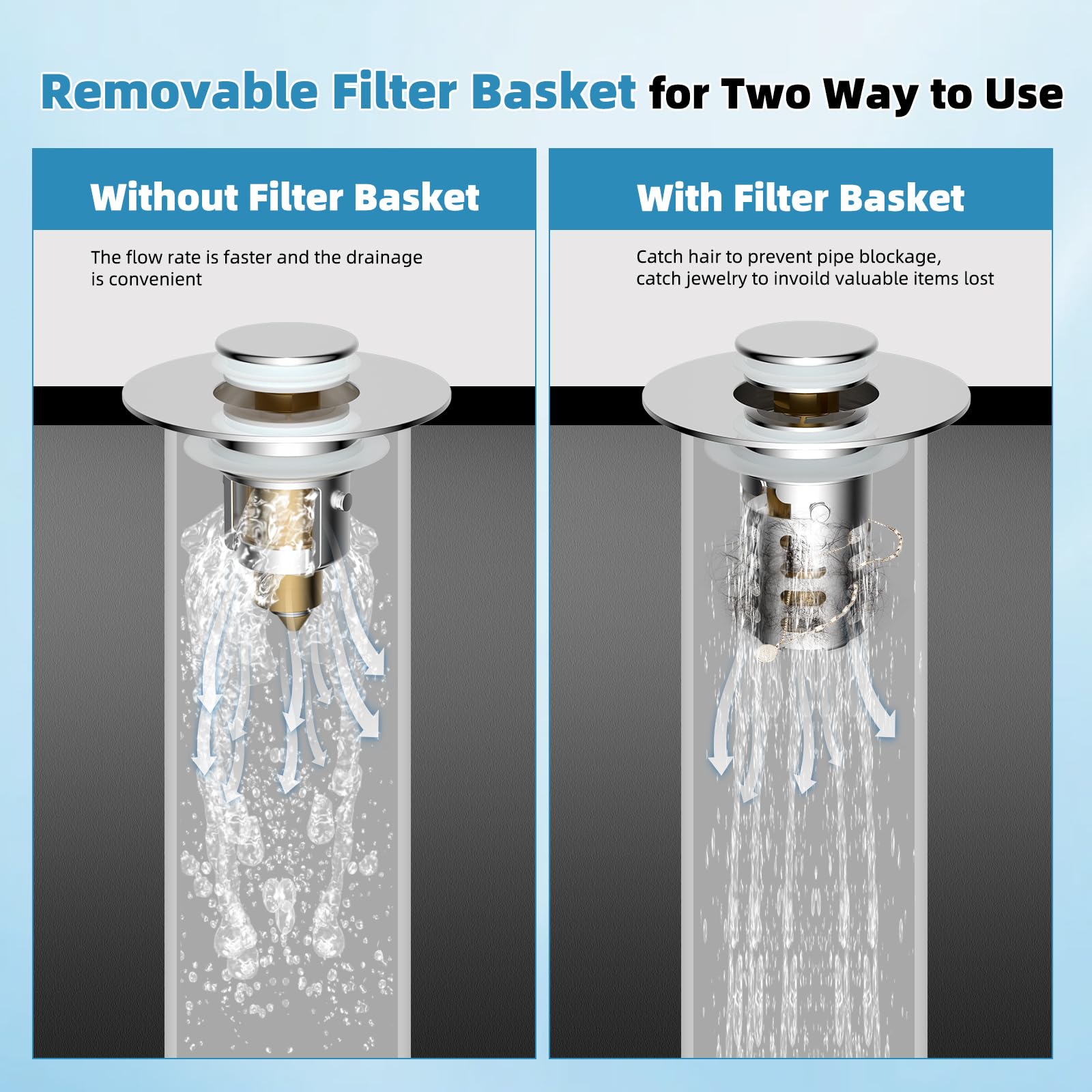 - Innovative Removable Metal Filter Basket: ①Effortless Capture: The fine metal mesh traps particles while allowing water to flow freely, avoiding standing water.②Easy Maintenance: Simply lift and rinse the basket—no need for messy manual cleanups or tools.③Safety Net: Saves accidental drops (e.g., earrings, rings) from disappearing into the drain