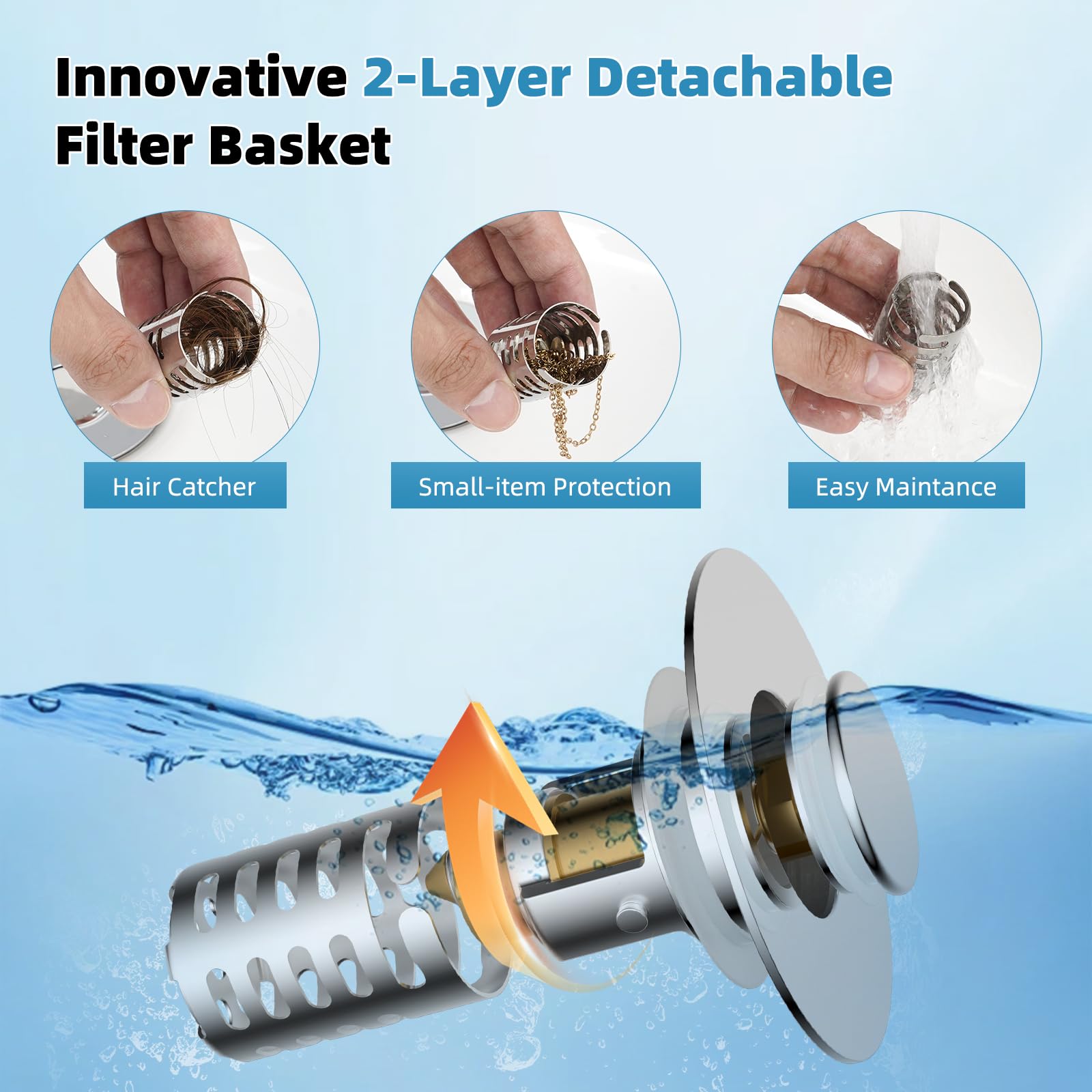 Universal Metal Bathroom Sink Drain Strainer Hair Catcher Upgraded 3 in 1 Pop-up Sink Stopper, with Detachable Stainless Steel Filter Basket, Fit for Standard 1.1''~2.36'' Basin Hole, Chrome