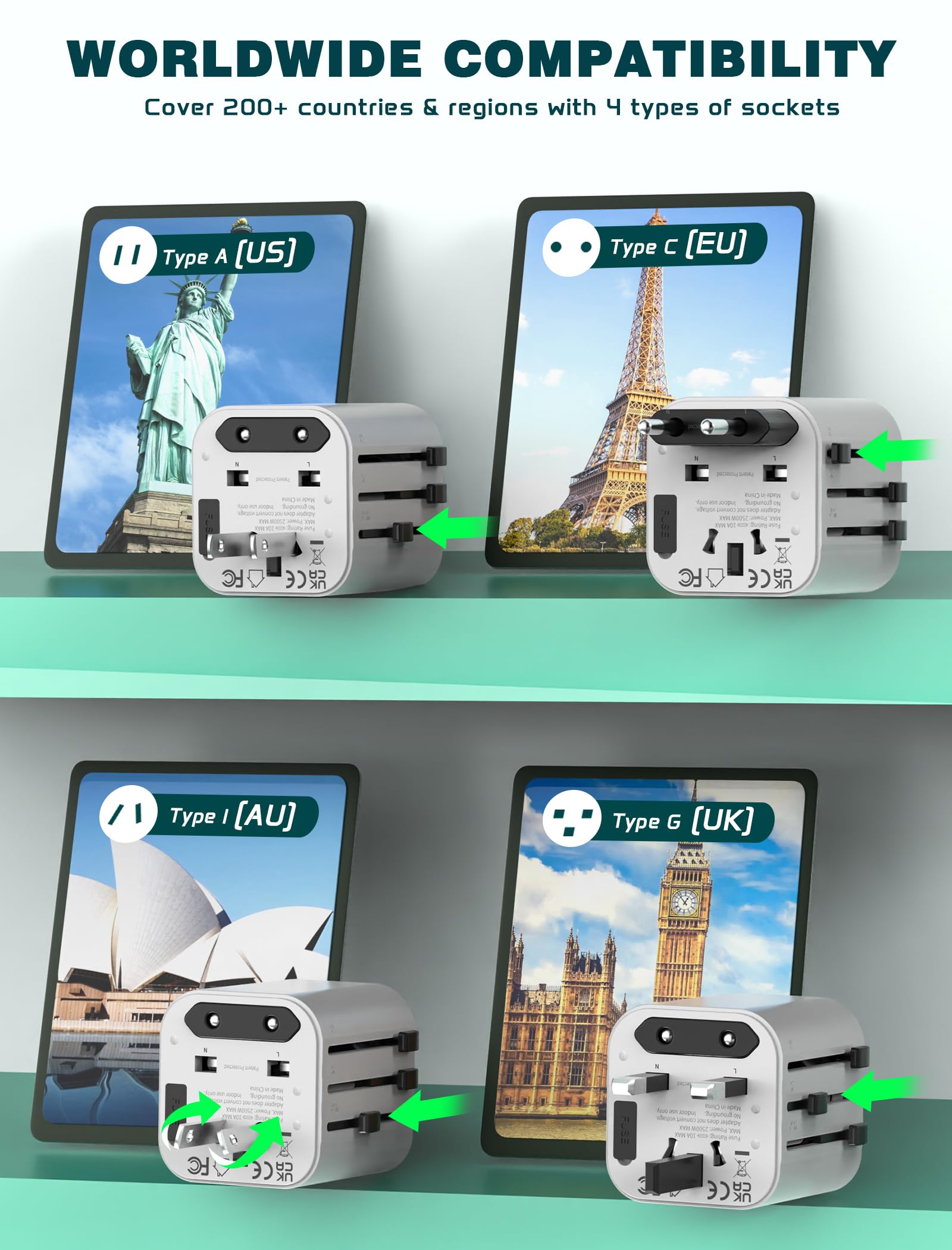 - Safe and Efficient Charging: Built with 8 safety protections, including a smart chip, 10A fuse, and fireproof materials, the universal travel plug adapter shields your devices from overheating, surges, and overcharging for worry-free travel worldwide.