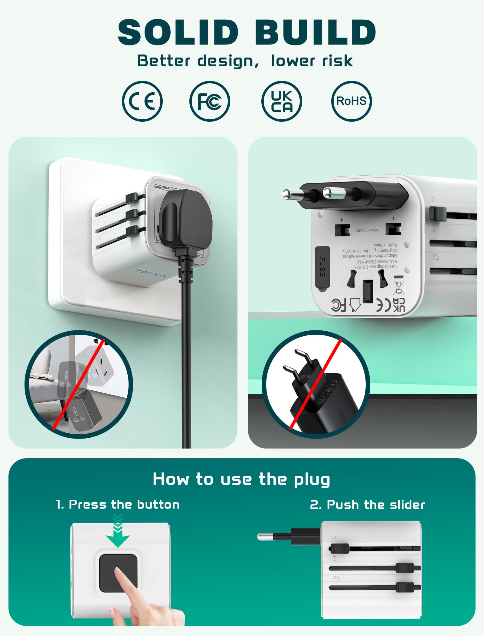 - Certified Quality & Silent Charging: With CE, UKCA, and FCC certifications, the world travel adapter guarantees safety and performance. Silent charging, smooth operation, and a push-button design make it the perfect travel essential in your journey.