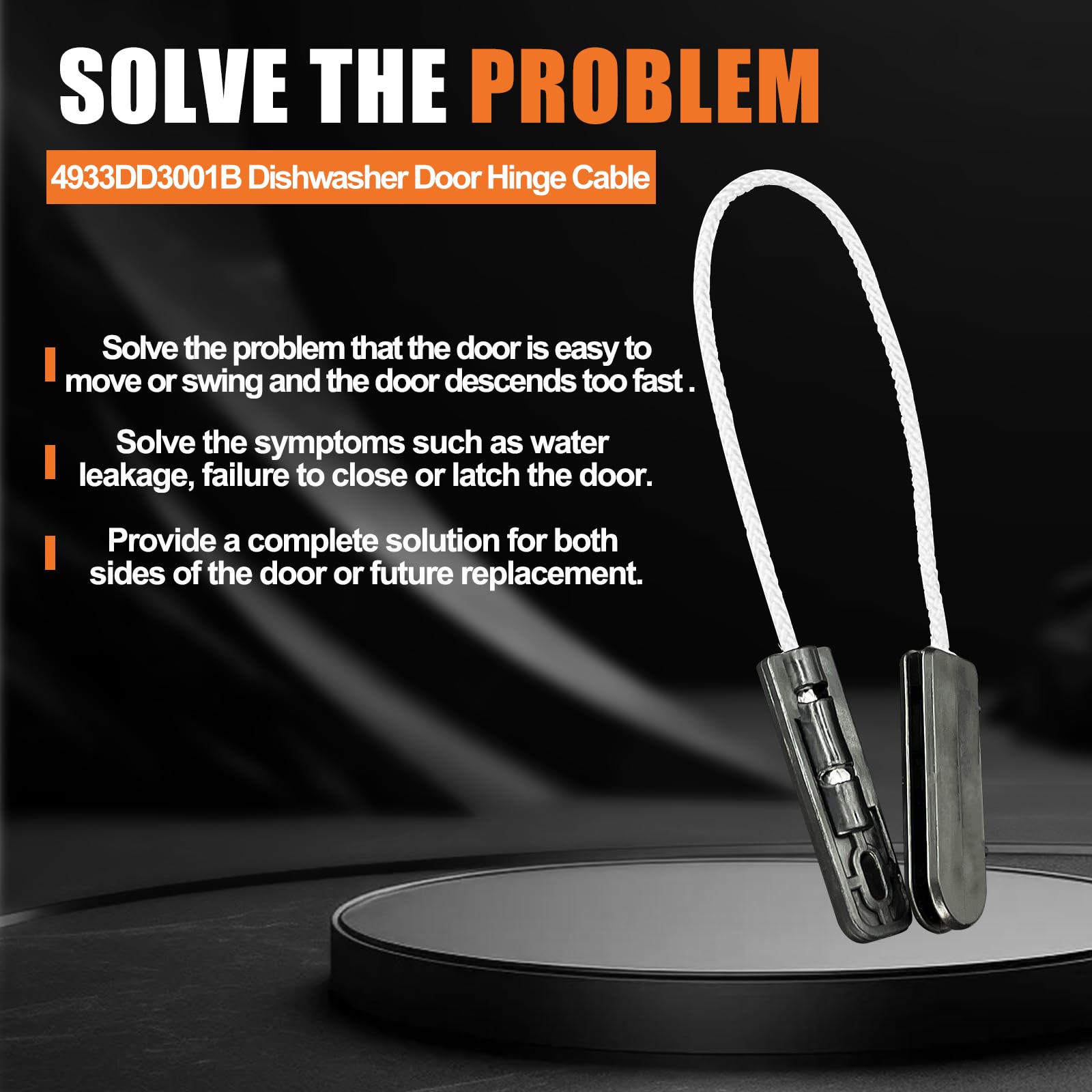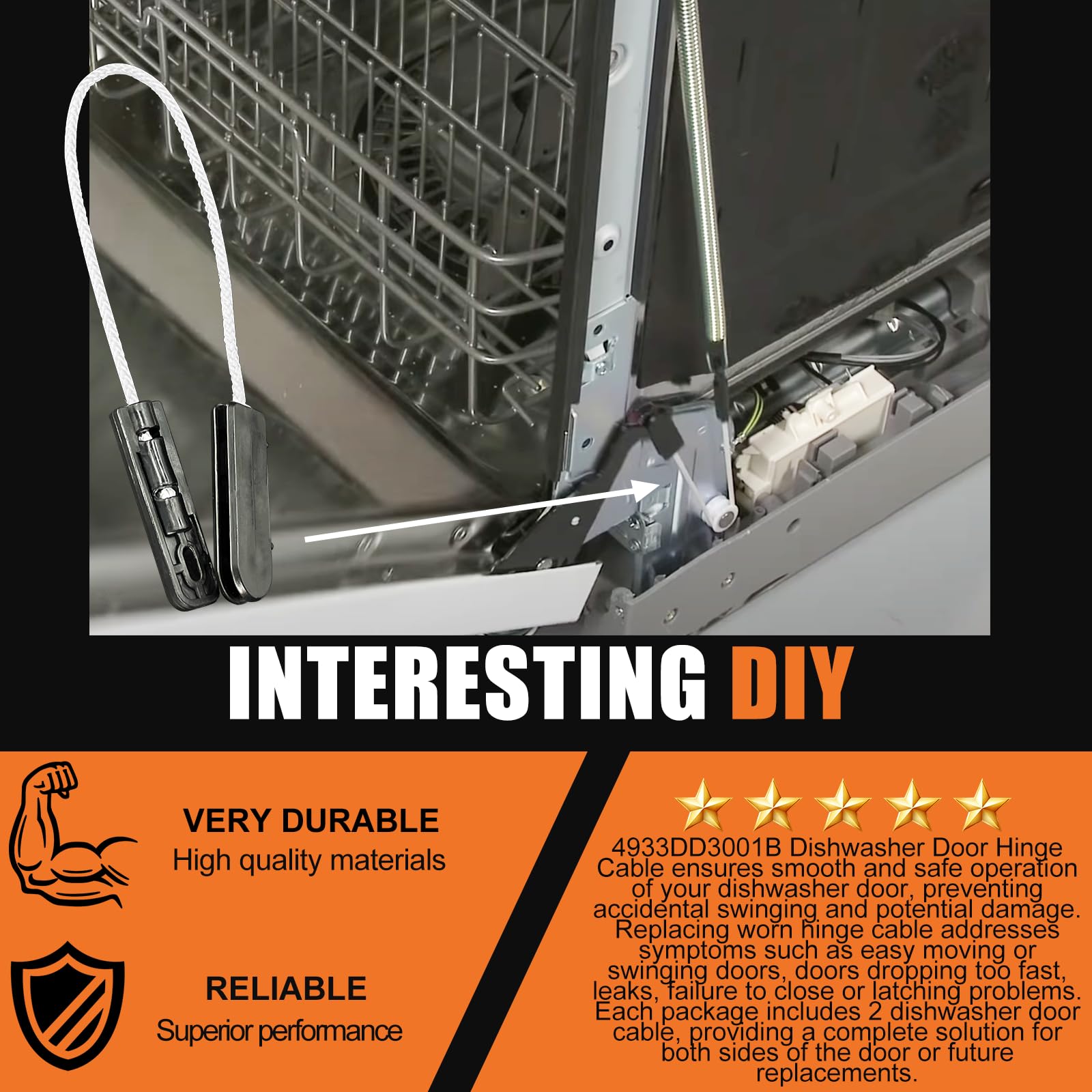 - GOOD SOLUTION: 4933DD3001B Dishwasher Door Hinge Cable ensures Smooth Dishwasher Door Operation, preventing accidental swinging and potential damage. Replacing worn hinge cable addresses symptoms such as easy moving or swinging doors, doors dropping too fast, leaks, failure to close or latching problems. Each package includes 2 dishwasher door cable, providing a complete solution for both sides of the door or future replacements
