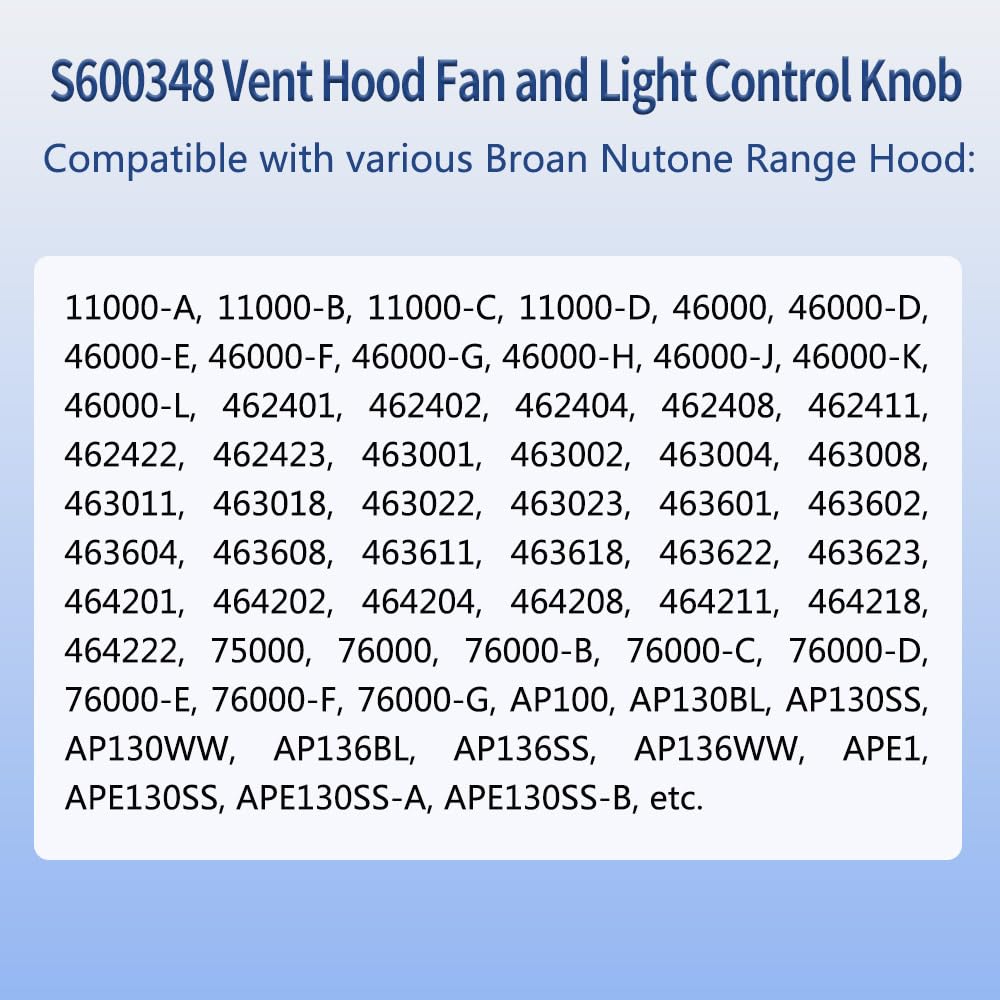 - 【Widely Applicable】The S600348 Hood Fan and Light Control Knob is compatible with various models: 11000 Series, 46000 Series, 4624 Series, 4630 Series, 4636 Series, 4642 Series, 75000, 76000 Series, AP13 Series, APE1 Series, etc.