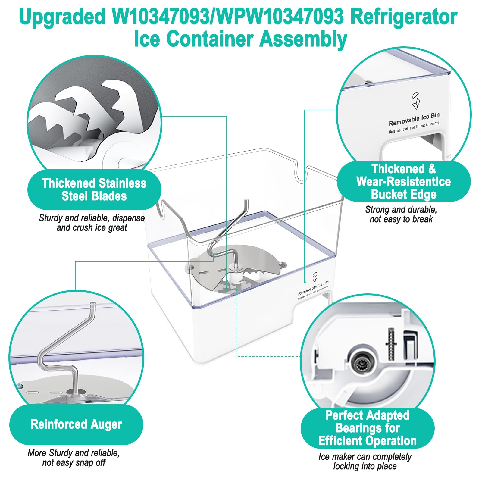 - 【Upgraded W10347093 Ice Maker Parts】Whirlpool W10347093 / WPW10347093 Refrigerator Ice Container Upgraded Versions include: thicken round plastic drive cup for not easy broken; reinforced ice auger that rotates to move the ice into the dispenser chute; thicken steel blades for sturdy and not easy to bent and rusted; precise stainless steel rod for perfect lock in positions. All W10347093 Whirlpoolice bucket parts are strictly tested before shipping and the quality exceeds OEM product.