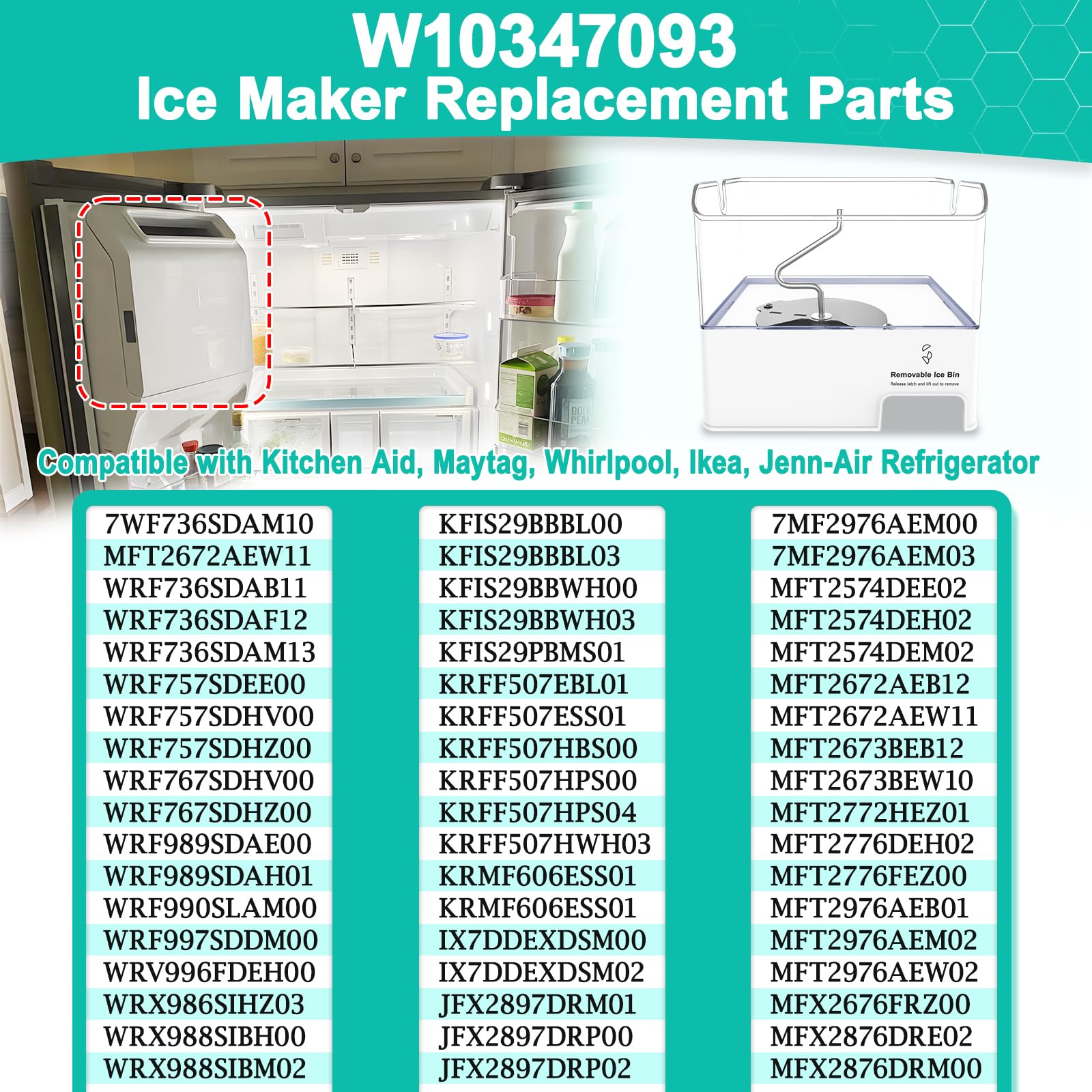 - 【W10347093 Ice Bucket for Whirlpool Refrigerator】This is W10347093 refrigerator ice bucket and auger assembly Compatible with Whirlpool, Kitchen Aid, Maytag, Ikea, Jenn-Air Refrigerator, Replaces Part Number is :WPW10347093, W10347100, 2311097, AP6020018, EAP11753329, PS11753329.