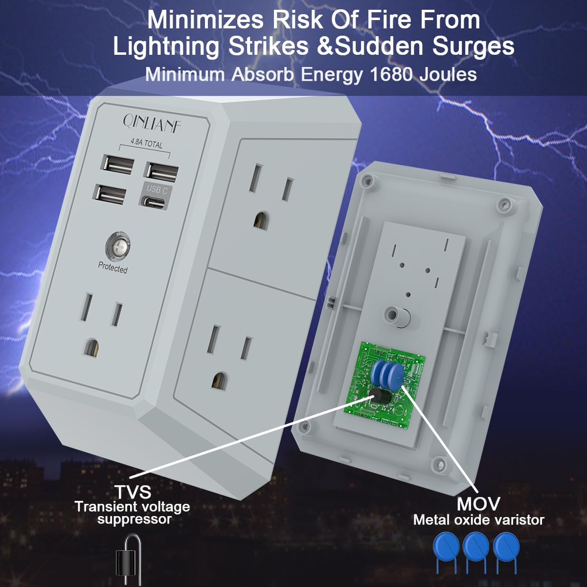 USB Wall Charger, Surge Protector, QINLIANF 5 Outlet Extender with 4 USB Charging Ports (4.8A Total) 3-Sided 1680J Power Strip Multi Plug Outlets Wall Adapter Spaced for Home Travel Office(3U1C),Grey