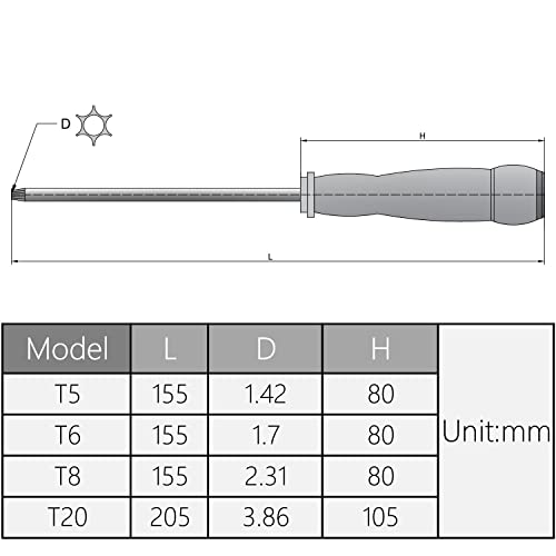 - ¡¼Dimension¡½- T20 torx head screwdriver with 4mm / 0.16-inch diameter 100mm / 3.94-inch long round shaft. The handle length is 105mm / 4.13-inch and total length is 205mm / 8.07-inch.