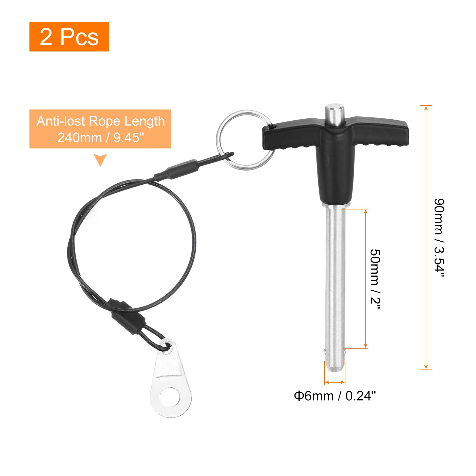- [Quick Release Pin] The size of the quick-release pin rod is 6x58mm/0.24x2.28inch (Dia*L), the usage length is 50mm/2inch, the length of the anti-lost rope is 240mm/9.45inch, the total length is 90mm/3.54inch, and the package includes 2 pcs quick-release pin, please select the correct size quick release pin.