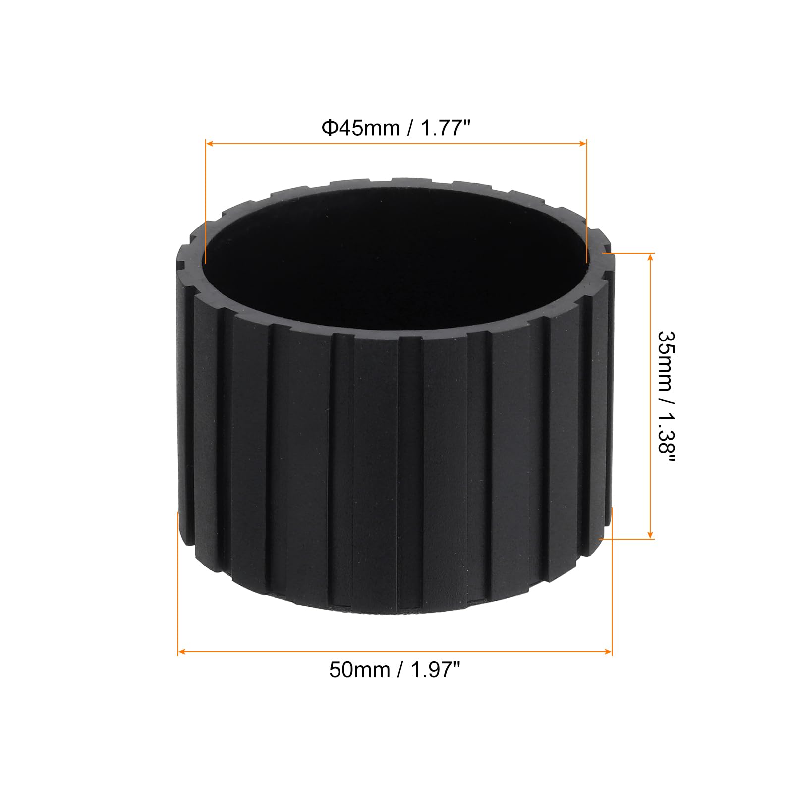 - Color: Black; Material: PVC Soft Glue; Length: 35 mm / 1.38"; Width: 50 mm / 1.97"; Inner Diameter: 45 mm / 1.77"; Bottom thickness: 6 mm / 0.24"; Package Content: 4Pcs x Chair Leg Tips Caps