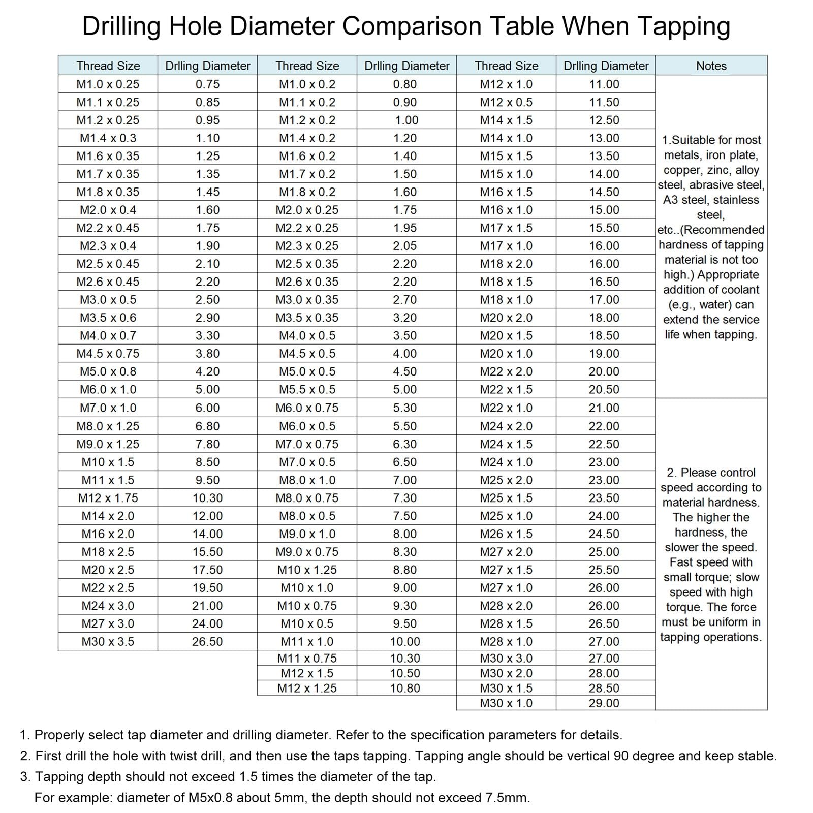 3. The tapping depth should not exceed 1.5 times the diameter of the tap (for example, the diameter M5x0.8 is about 5mm, and the depth should not exceed 7.5mm.)