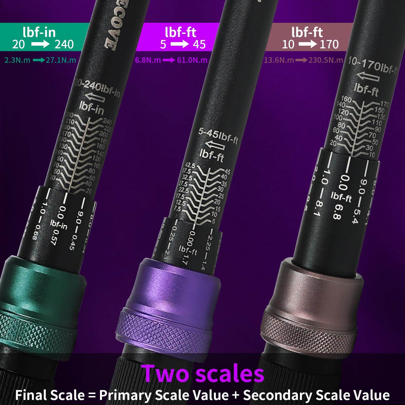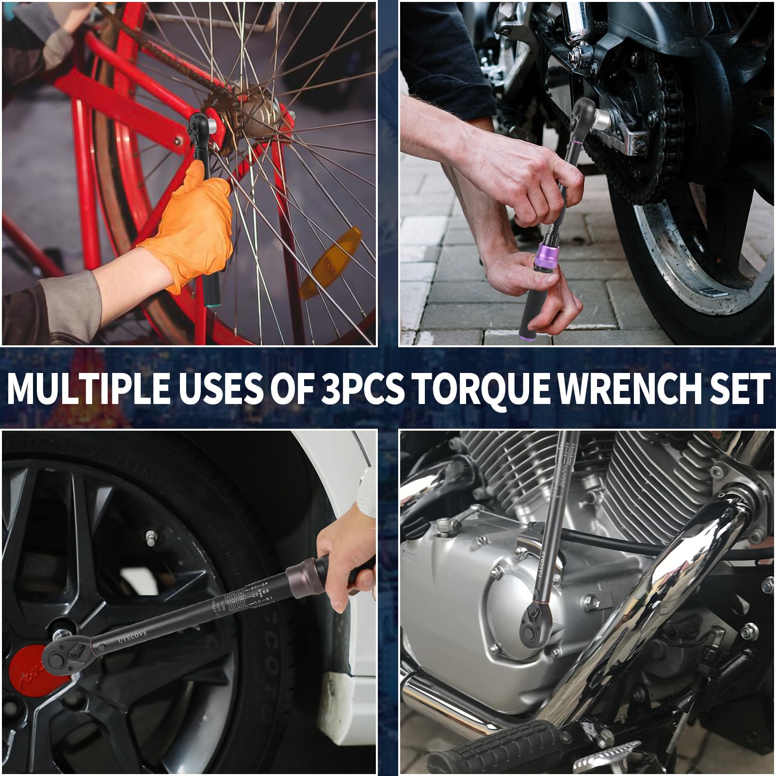 - Widely Use: These torque wrenches satisfy a wide range of applications, including bike, car, motorcycle, truck, and wheel screws amongst others. The UYECOVE torque wrench set is a must-have tool for both professional and DIY users.The 3-in-1 torque wrench set can meet your different needs. Including 1/4 inch 20-240 in.lb, 3/8 inch 5-45 ft.lb, 1/2 inch 20-160 ft.lb,with 1 adapter