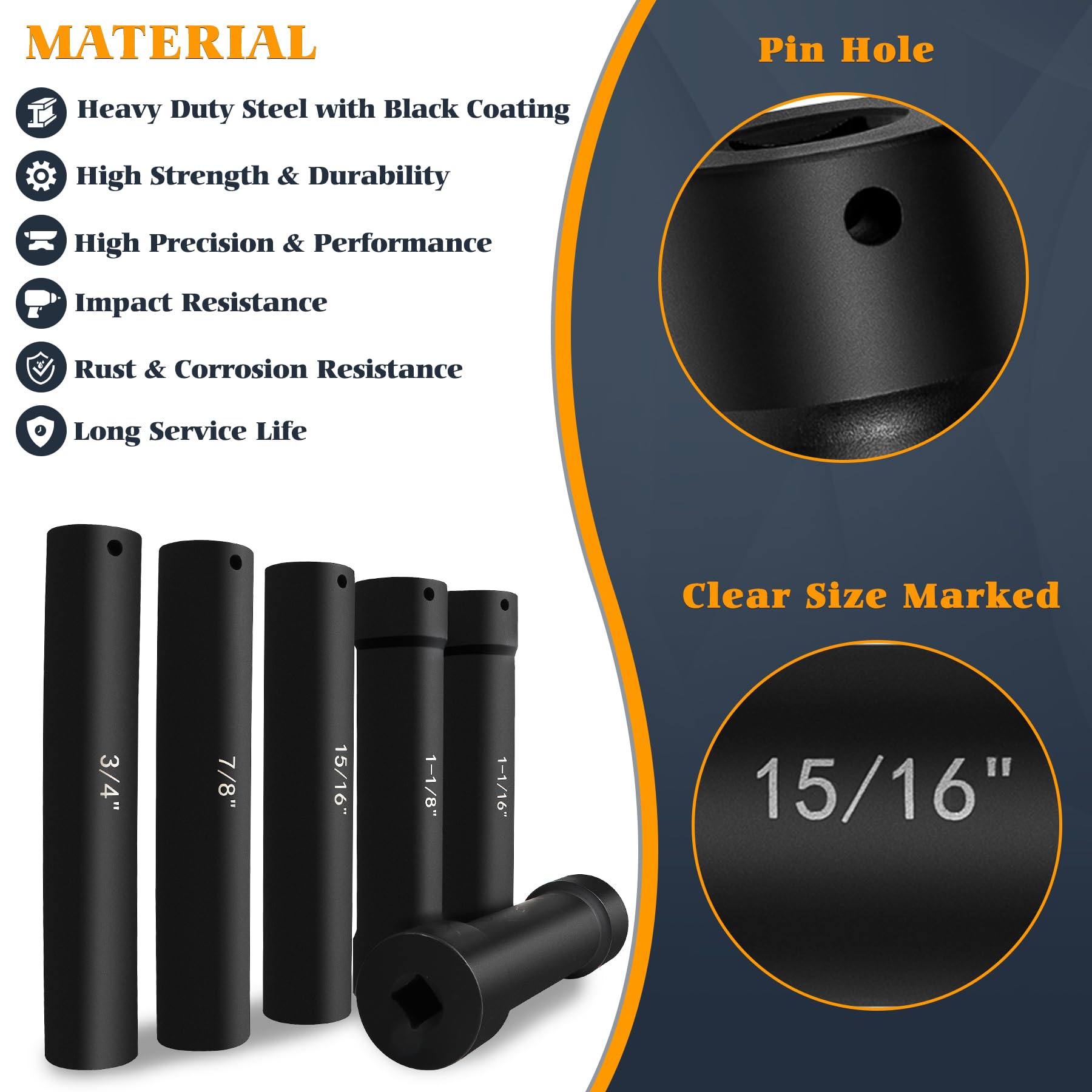 - 6PCS EXTRA LONG SOCKETS SET - With Length of 6.75 to 6.80 inch, includes 6 different Hex sizes of 3/4", 7/8", 15/16", 1-1/16", 1-1/8", 1-1/4", ideal for hard to reach deep well bolts
