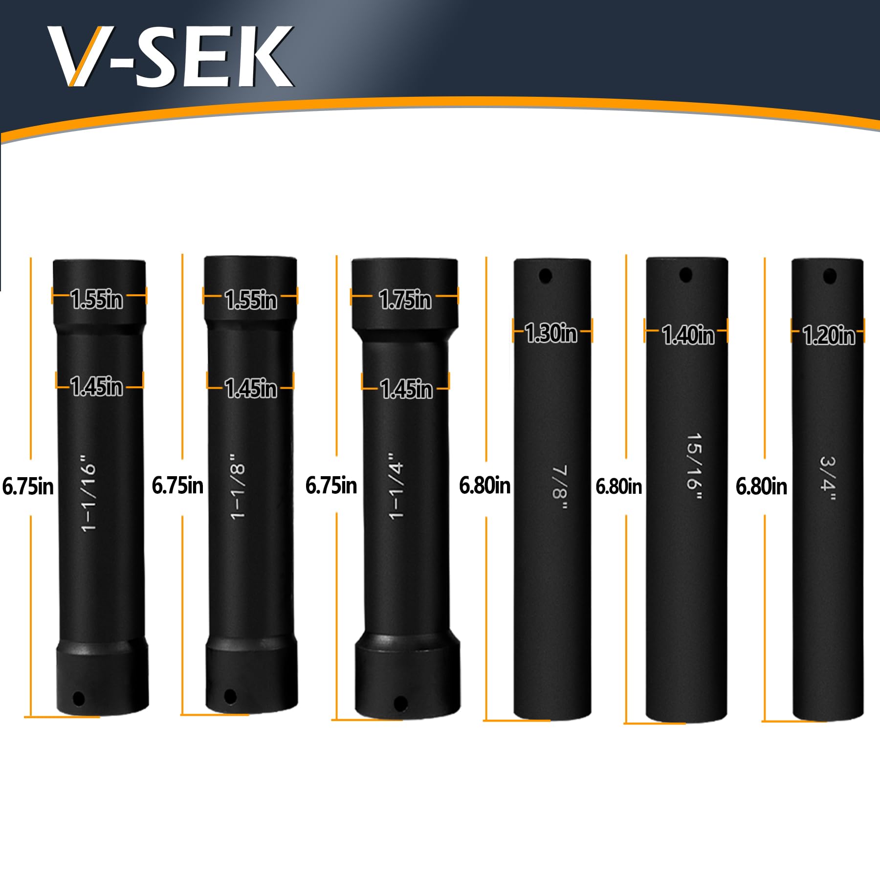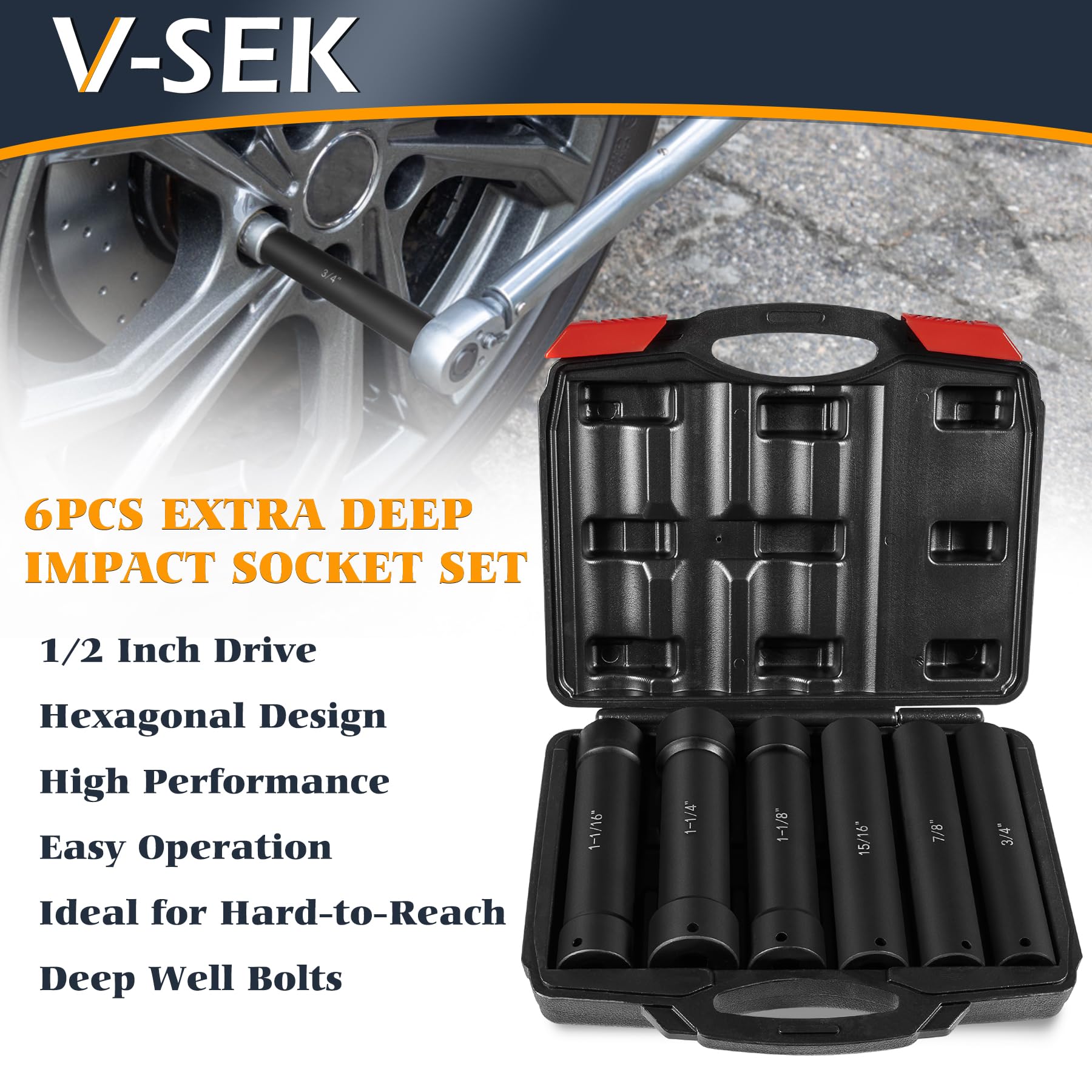 V-SEK 6.75 Inch Long Extended Length Impact Socket Set 1/2 Inch Drive Extra Deep Sockets Heavy Duty Steel With Hex Sizes 3/4" 7/8" 15/16" 1-1/16" 1-1/8" 1-1/4" for High Torque Use 6PCS