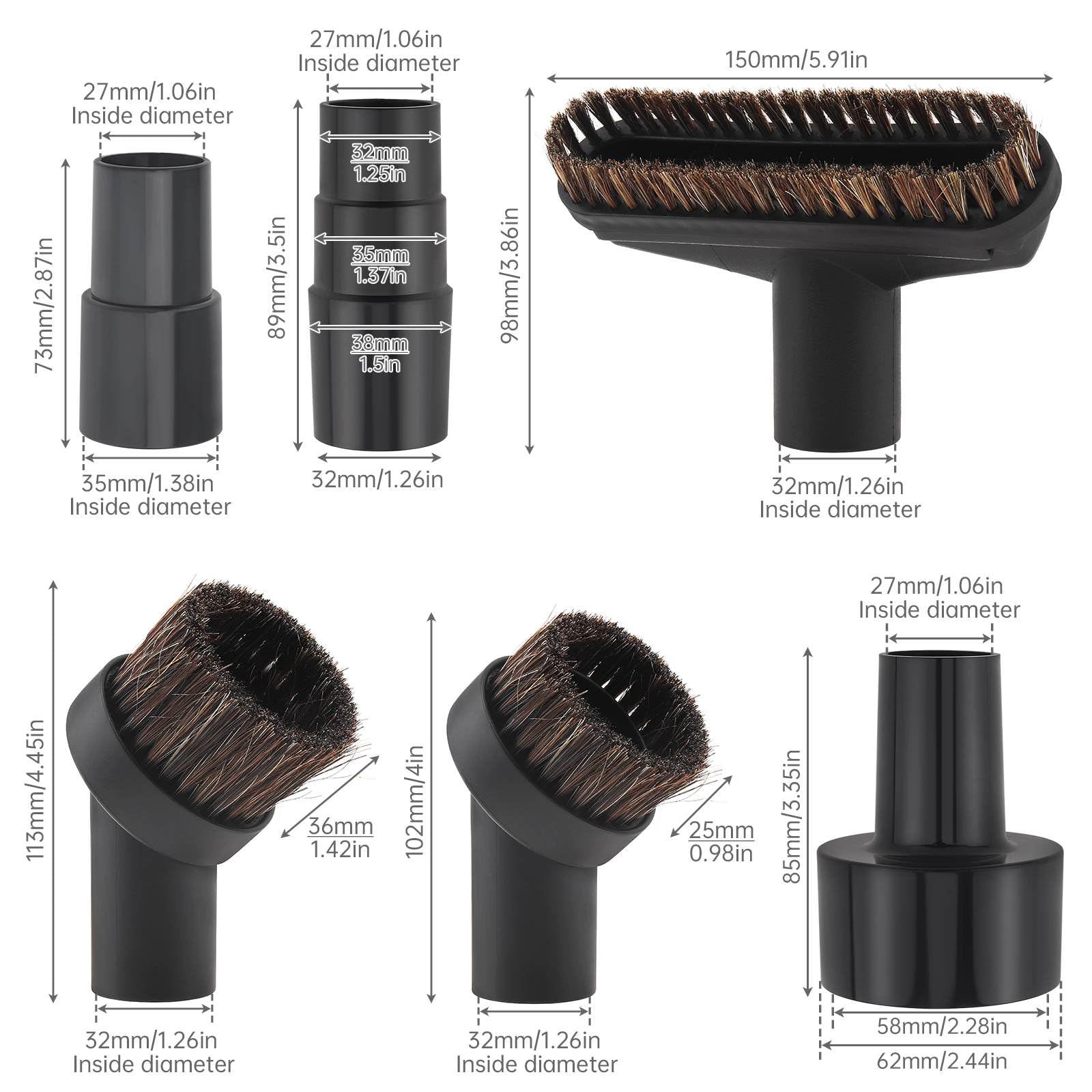 - 💖Vacuum Brushes Cleaning Set - Please check your vacuum cleaner dimensions before purchasing. This vacuum brushes attachment set includes 6 pieces, coming with 3PC of 1.26" soft bristles brushes and 1-1/4 to 1-3/8 vacuum attachments, the inner diameter is the standard size of 1.26 inch/ 32 mm. These accessories can be applied for most household vacuum cleaners.