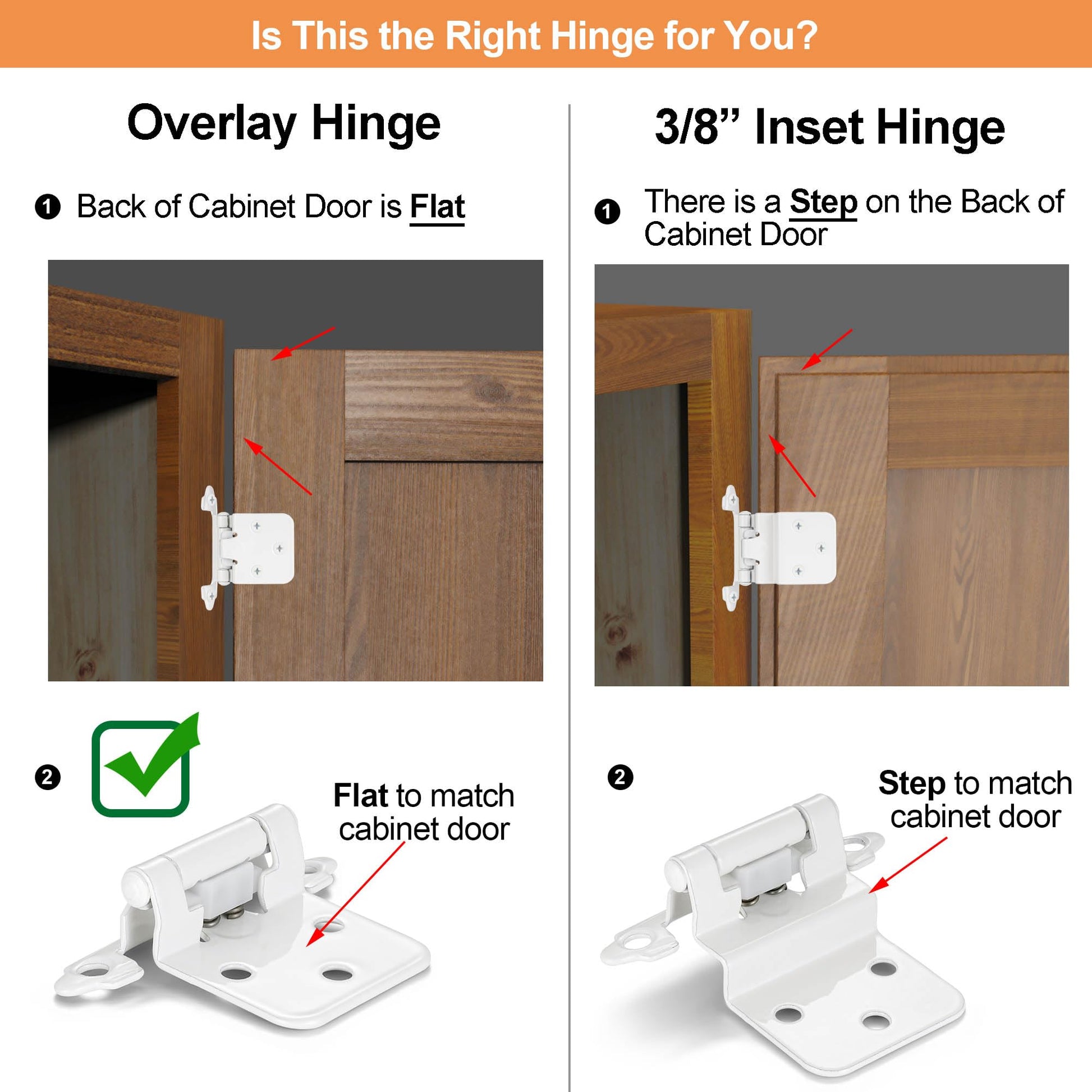 - Overlay Hinges: It only work for face frame cabinet. Some people also call it face mount or flush mount hinges