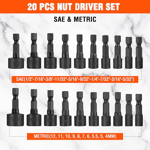 - Set Include: VALUEMAX nut driver bit set includes 10PCS metric nut driver(4mm, 5mm, 5.5mm, 6mm, 7mm, 8mm, 9mm, 10mm, 11mm, 12mm) , 10PCS SAE nut driver£º (5/32'', 3/16'', 7/32'', 1/4'', 9/32'', 5/16'', 11/32'', 3/8'', 7/16'', 1/2'')