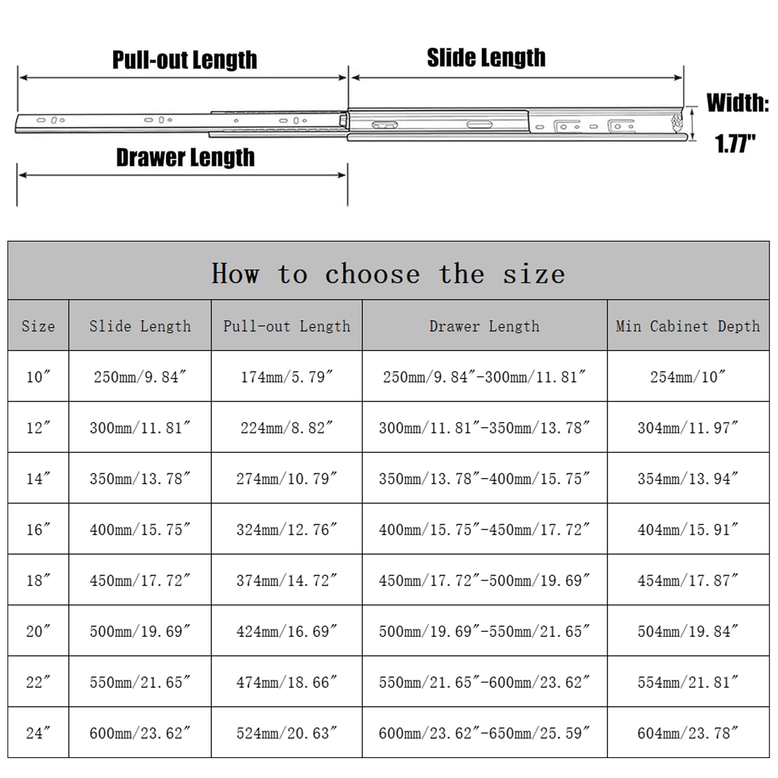 - 【MEASUREMENTS】Length: 18 inches (450 mm); Width: 1.7 inches (45 mm); Thickness: 1/2 inch (12.7 mm); Weight capacity: 100 lbs. Please measure the length of the drawer without frame boards before purchasing so you can choose the right size. Please note that the length of the slide cannot exceed the depth of the cabinet box.