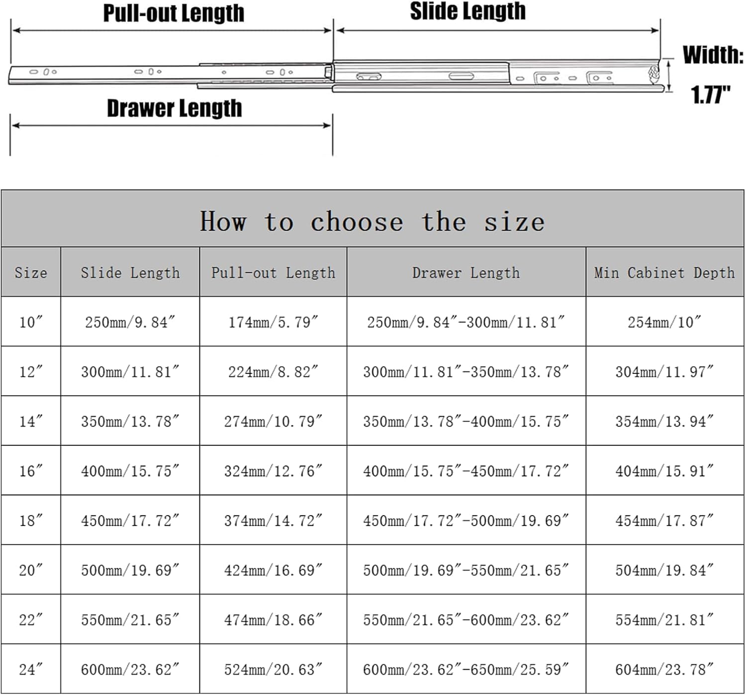 - 【MEASUREMENTS】Length: 20 inches(500 mm); Width: 1.7 inches(45 mm); Thickness: 1/2 inch(12.7 mm); Weight capacity: 100 lbs. Please measure the length of the drawer without frame boards before purchasing so you can choose the right size. Please note that the length of the slide cannot exceed the depth of the cabinet box.