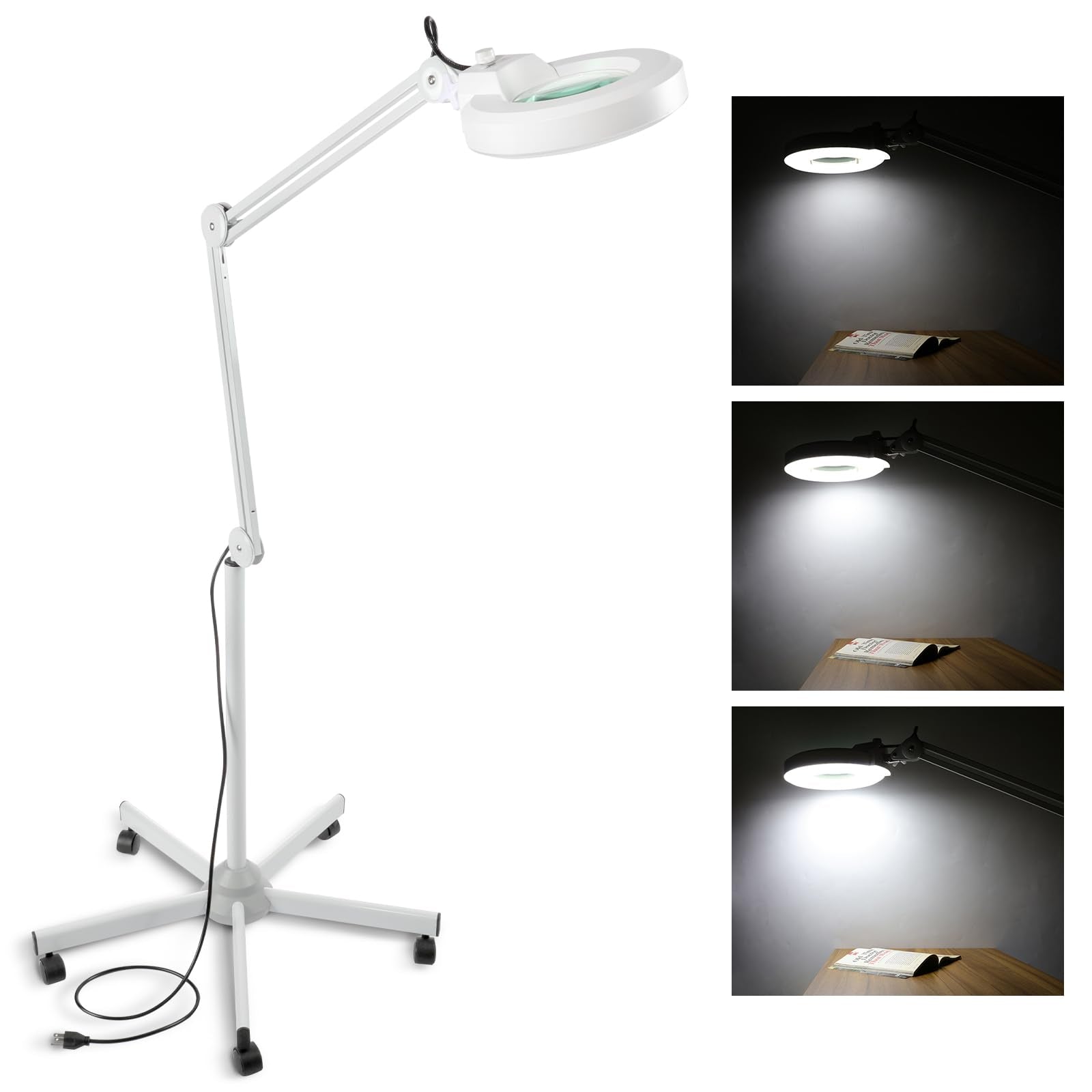 - [Adjustable Mag Floor Lamp]: You can either use it as an LED magnifying glass floor lamp. Best rolling base has 5 wheels as it rolls easily across carpeting, floors, has the best stability. The lens can rotate left and right with 360 degrees and flip up and down 180 degrees, Just adjust your magnifier lamp to your demands to Free both hands to work.